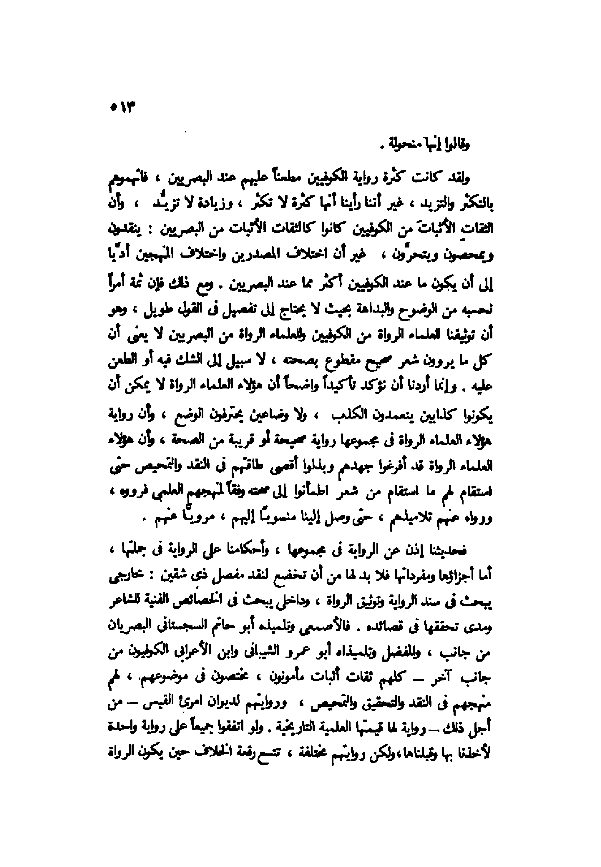 ولقد كانت كثرة رواية الكوفيين مطعنًا عليهم عند البصريين، فاتهموهم بالتكثير والتزيد، غير أننا رأينا أنها كثرة لا تكثر، وزيادة لا تزيد، وأن الثقات الأثبات من الكوفيين كانوا كالثقات الأثبات من البصريين: ينقدون ويمحصون ويتحرون، غير أن اختلاف المصدرين واختلاف المنهجين أدَّيا إلى أن يكون ما عند الكوفيين أكثر مما عند البصريين. ومع ذلك فإن ثمة أمرًا تحسبه من الوضوح والبداهة بحيث لا يحتاج إلى تفصيل في القول طويل، وهو أن توثيقنا للعلماء الرواة من الكوفيين وللعلماء الرواة من البصريين لا يعني أن كل ما يروون شعر صحيح مقطوع بصحته، لا سبيل إلى الشك فيه أو الطعن عليه. وإنما أردنا أن نؤكد تأكيدًا واضحًا أن هؤلاء العلماء الرواة لا يمكن أن يكونوا كذابين يتعمدون الكذب، ولا وضاعين يحترفون الوضع، وأن رواية هؤلاء العلماء الرواة في مجموعها رواية صحيحة أو قريبة من الصحة، وأن هؤلاء العلماء الرواة قد أفرغوا جهدهم وبذلوا أقصى طاقتهم في النقد والتمحيص حتى استقام لهم ما استقام من شعر اطمأنوا إلى صحته وفقًا لمنهجهم العلمي فرووه، ورواه عنهم تلاميذهم، حتى وصل إلينا منسوبًا إليهم، مرويًّا عنهم.