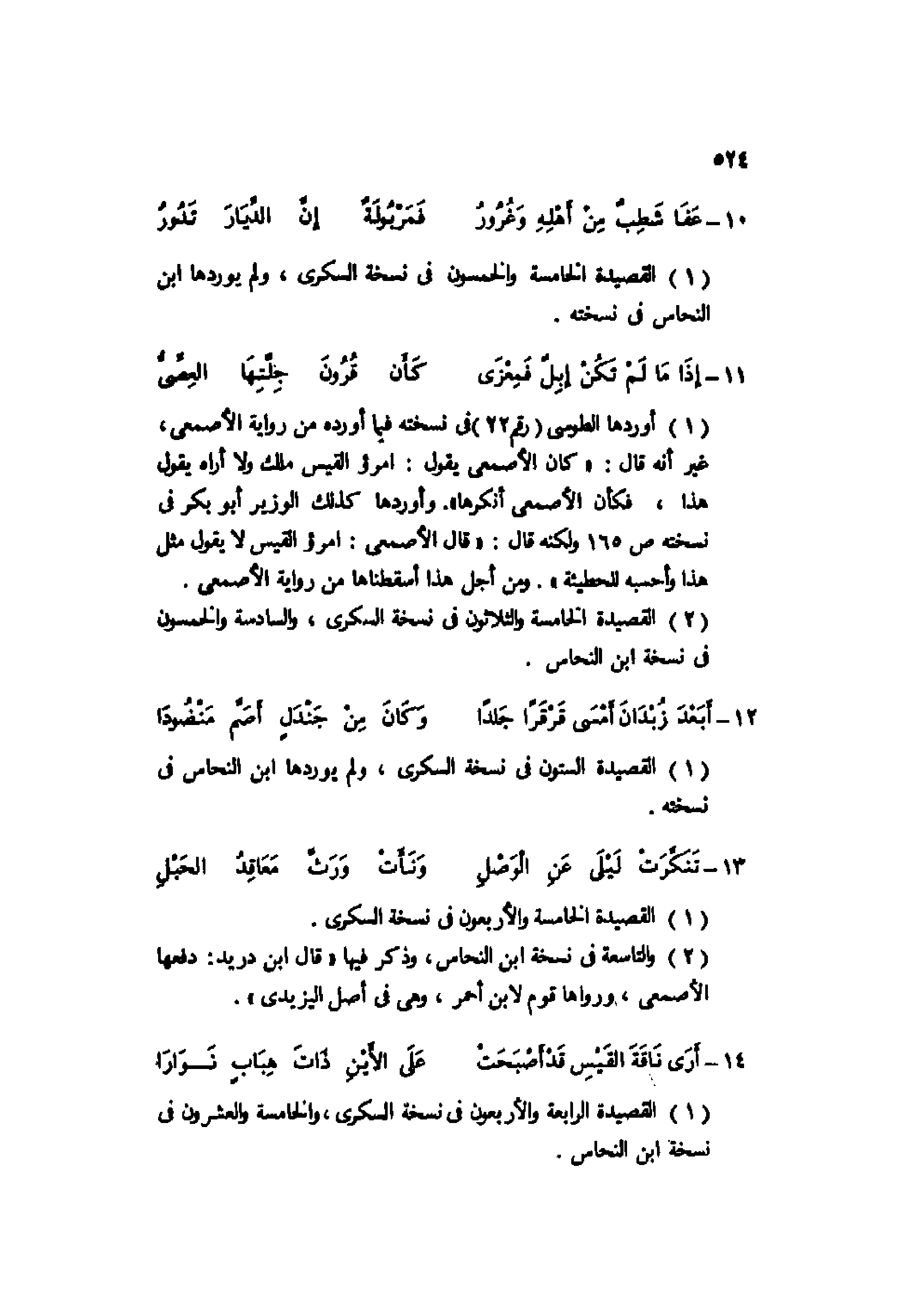 1- أوردها الطوسي "رقم 22" في نسخته فيما أورده من رواية الأصمعي، غير أنه قال: "كان الأصمعي يقول: امرؤ القيس ملك ولا أراه يقول هذا، فكأن الأصمعي أنكرها". وأوردها كذلك الوزير أبو بكر في نسخته ص165 ولكنه قال: "قال الأصمعي: امرؤ القيس لا يقول مثل هذا وأحسبه للحطيئة". ومن أجل هذا أسقطناها من رواية الأصمعي.