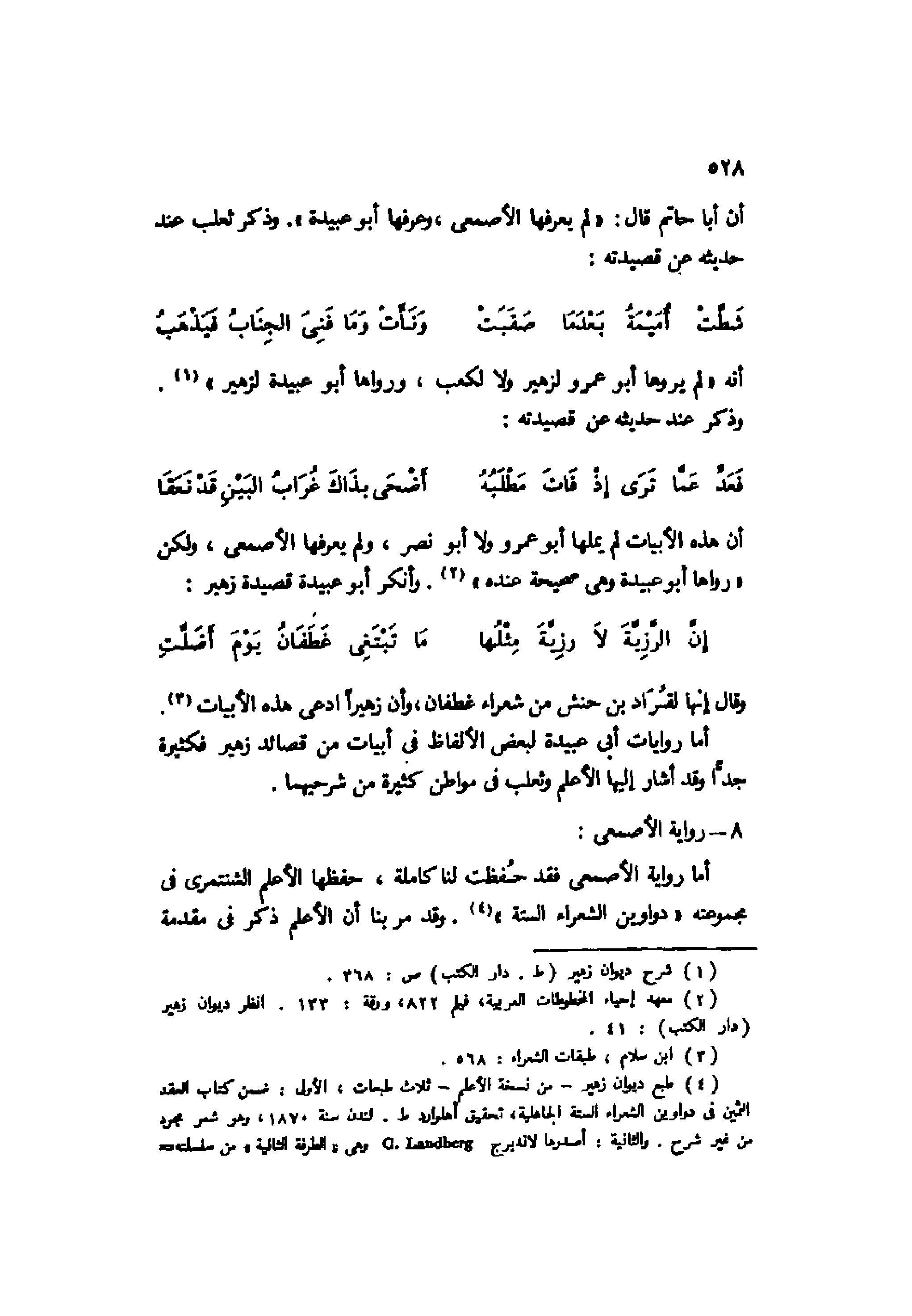 4 طبع ديوان زهير -من نسخة الأعلم- ثلاث طبعات، الأولى: ضمن كتاب العقد الثمين في دواوين الشعراء الستة الجاهلية، تحقيق أهلوارد ط. لندن سنة 1870، وهو شعر مجرد من غير شرح. والثانية: أصدرها لاندبرج G. Landberg وهي الطريقة الثانية" من سلسلة طرف عربية"، ط. ليدن سنة 1889 وفيها شرح الأعلم9 والثالثة: طبعت بالمطبعة الحميدة بمصر سنة 1323هـ: وفيها شرح الأعلم كذلك. أما نسخة الأعلم من مجموعة الدواوين الستة الكاملة، فقد ذكرنا عند حديثنا عنها قبل صفحات أن منها مخطوطتين في دار الكتب المصرية برقم 450 تيمور و 81 ش، وذلك غير النسخ التي ذكرها أهلوارد في طبعته وأشرنا إليها في حديثنا عن ديوان امرئ القيس.