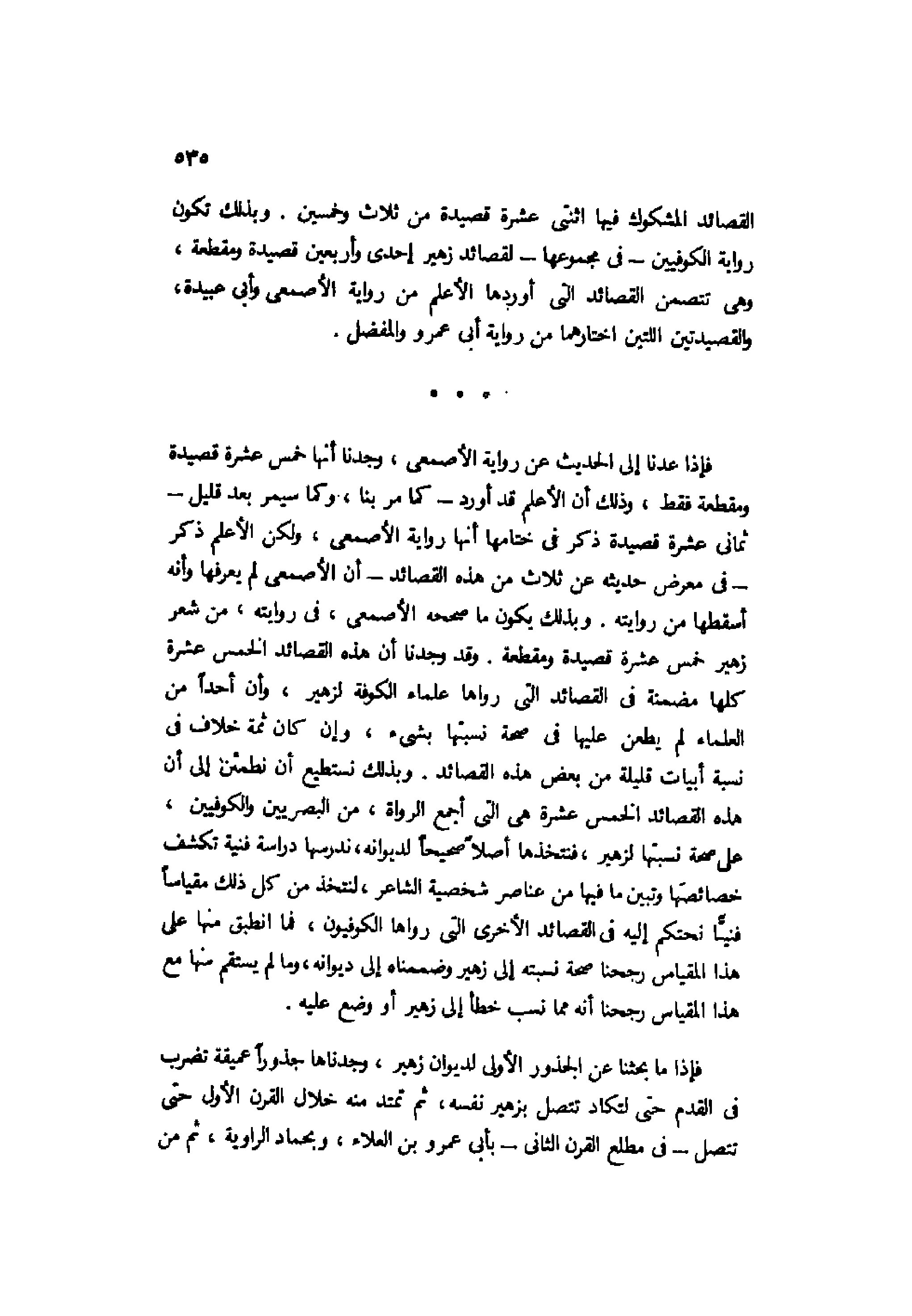 فإذا عدنا إلى الحديث عن رواية الأصمعي، وجدنا أنها خمس عشرة قصيدة ومقطعة فقط، وذلك أن الأعلم قد أورد -كما مر بنا، وكما سيمر بعد قليل- ثماني عشرة قصيدة ذكر في ختامها أنها رواية الأصمعي، ولكن الأعلم ذكر -في معرض حديثه عن ثلاث من هذه القصائد- أن الأصمعي لم يعرفها وأنه أسقطها من روايته. وبذلك يكون ما صححه الأصمعي، في روايته، من شعر زهير خمس عشرة قصيدة ومقطعة. وقد وجدنا أن هذه القصائد الخمس عشرة كلها مضمنة في القصائد التي رواها علماء الكوفة لزهير، وأن أحدًا من العلماء لم يطعن عليها في صحة نسبتها بشيء، وإن كان ثمة خلاف في نسبة أبيات قليلة من بعض هذه القصائد. وبذلك نستطيع أن نطمئن إلى أن هذه القصائد الخمس عشرة هي التي أجمع الرواة، من البصريين والكوفيين، على صحة نسبتها لزهير، فنتخذها أصلًا صحيحًا لديوانه، ندرسها دراسة فنية تكشف خصائصها وتبين ما فيها من عناصر شخصية الشاعر، لنتخذ من كل ذلك مقياسًا فنيًّا نحتكم إليه في القصائد الأخرى التي رواها الكوفيون، فما انطبق منها على هذا المقياس رجحنا صحة نسبته إلى زهير وضممناه إلى ديوانه، وما لم يستقم منها مع هذا المقياس رجحنا أنه مما نسب خطأ إلى زهير أو وضع عليه.