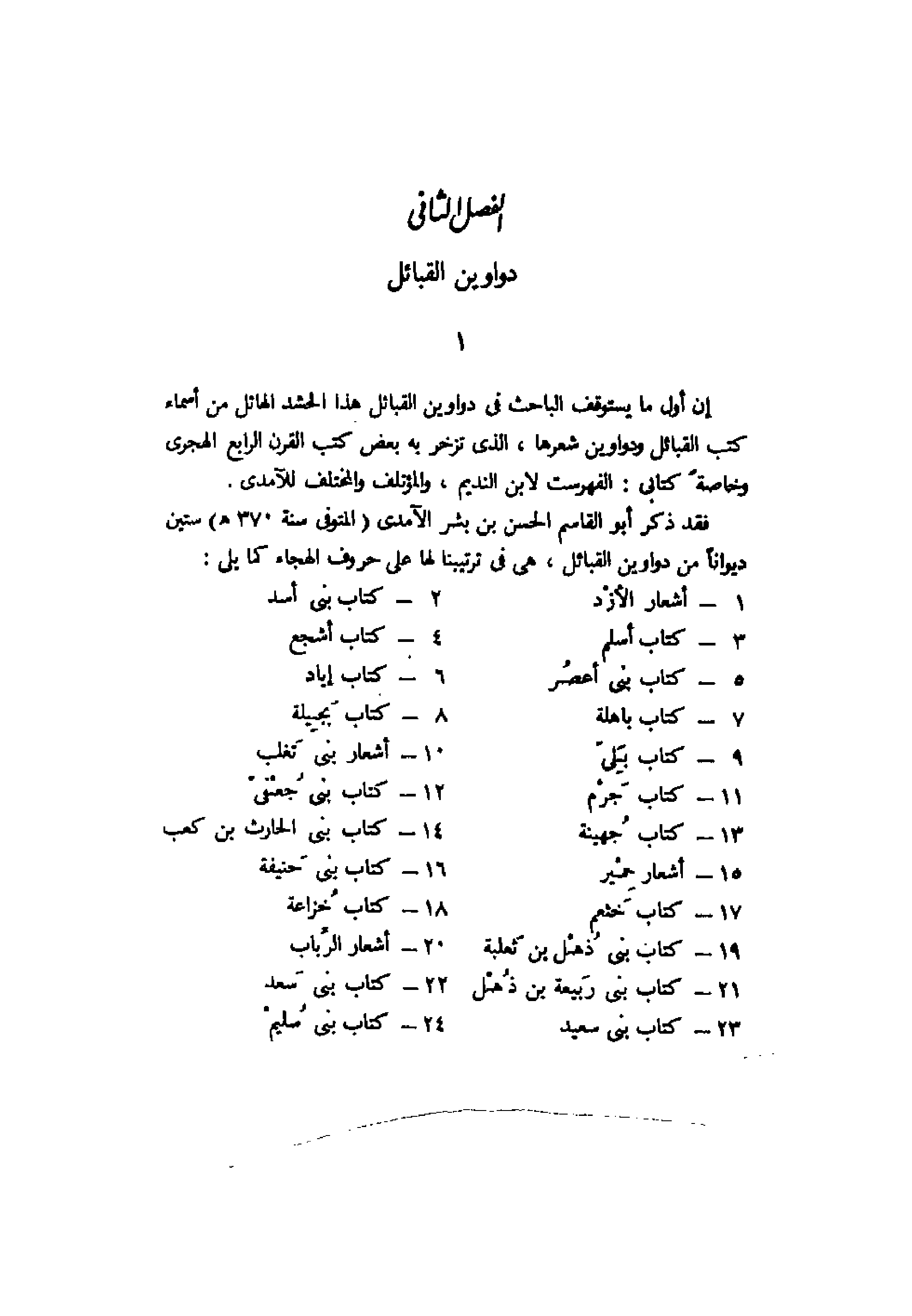 إن أول ما يستوقف الباحث في دواوين القبائل هذا الحشد الهائل من أسماء كتب القبائل ودواوين شعرها، الذي تزخر به بعض كتب القرن الرابع الهجري وخاصة كتابي: الفهرست لابن النديم، والمؤتلف والمختلف للآمدي.