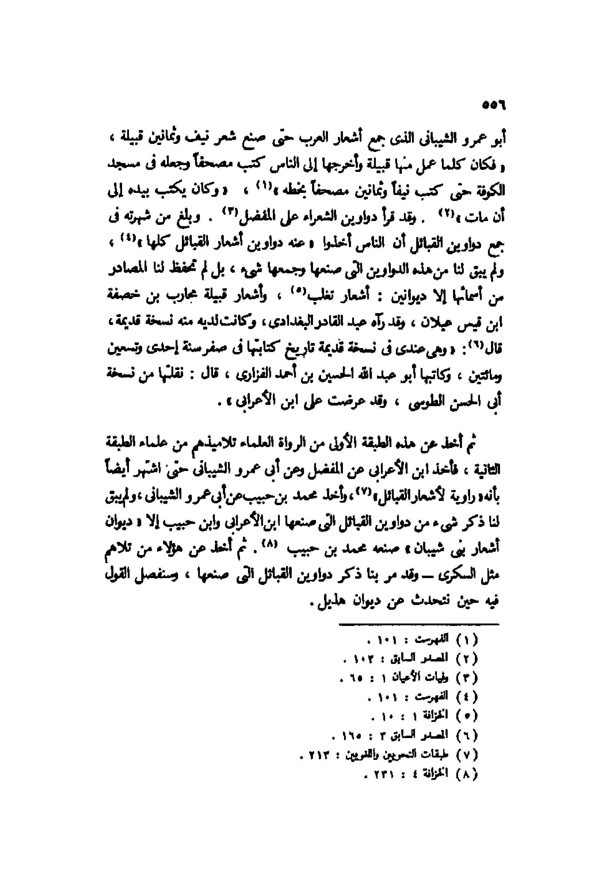 أبو عمرو الشيباني الذي جمع أشعار العرب حتى صنع شعر نيف وثمانين قبيلة، "فكان كلما عمل منها قبيلة وأخرجها إلى الناس كتب مصحفًا وجعله في مسجد الكوفة حتى كتب نيفًا وثمانين مصحفًا بخطه"1، "وكان يكتب بيده إلى أن مات"2. وقد قرأ دواوين الشعراء على المفضل3. وبلغ من شهرته في جمع دواوين القبائل أن الناس أخذوا "عنه دواوين أشعار القبائل كلها"4، ولم يبق لنا من هذه الدواوين التي صنعها وجمعها شيء، بل لم تحفظ لنا المصادر من أسمائها إلا ديوانين: أشعار تغلب5، وأشعار قبيلة محارب بن خصفة بن قيس عيلان، وقد رآه عبد القادر البغدادي، وكانت لديه منه نسخة قديمة، قال6: "وهي عندي في نسخة قديمة تاريخ كتابتها في صفر سنة إحدى وتسعين ومائتين، وكاتبها أبو عبد الله الحسين بن أحمد الفزاري، قال: نقلتها من نسخة أبي الحسن الطوسي، وقد عرضت على ابن الأعرابي".