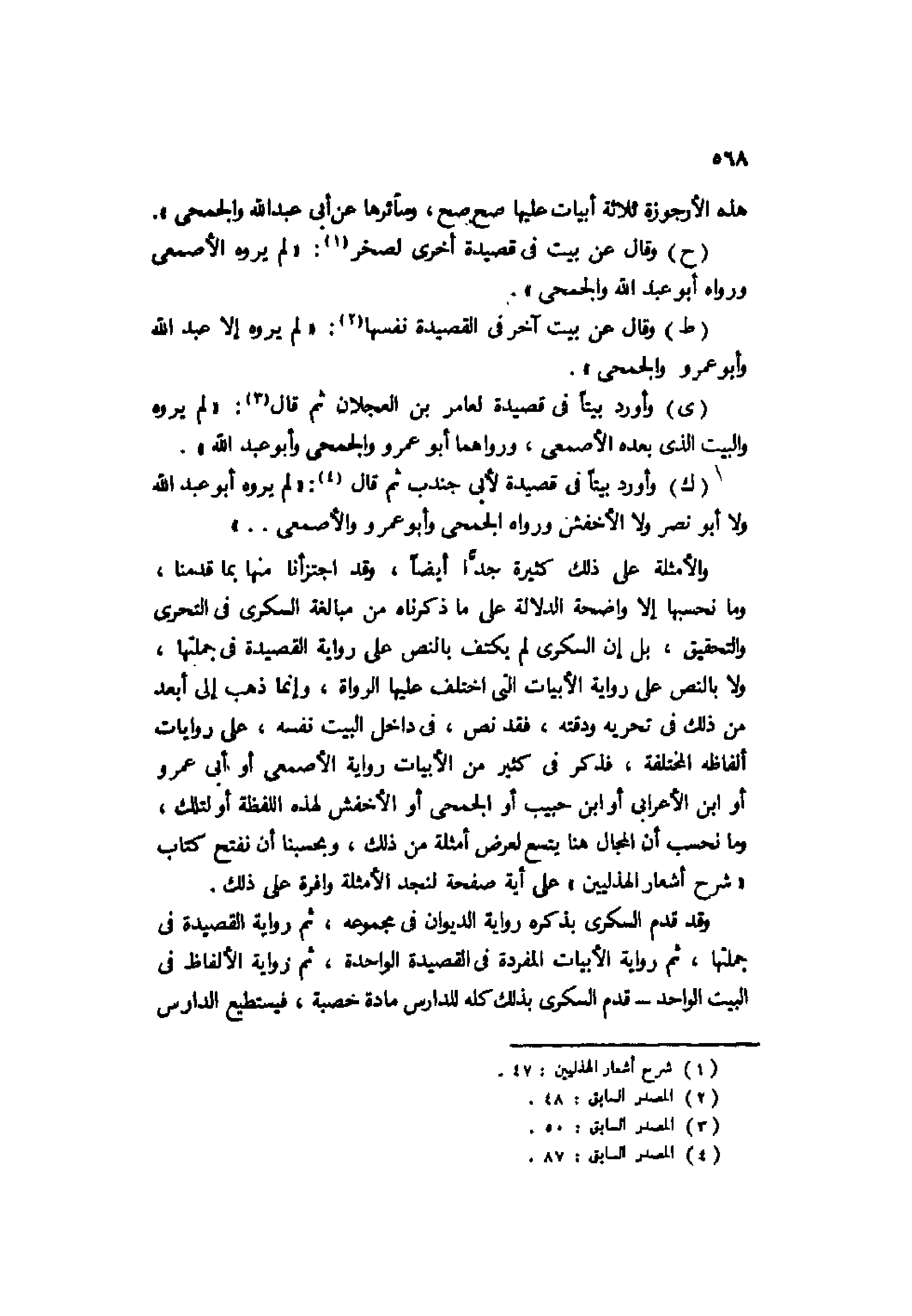 ك- وأورد بيتًا في قصيدة لأبي جندب ثم قال4: "لم يروه أبو عبد الله ولا أبو نصر ولا الأخفش ورواه الجمحي وأبو عمرو والأصمعي..".