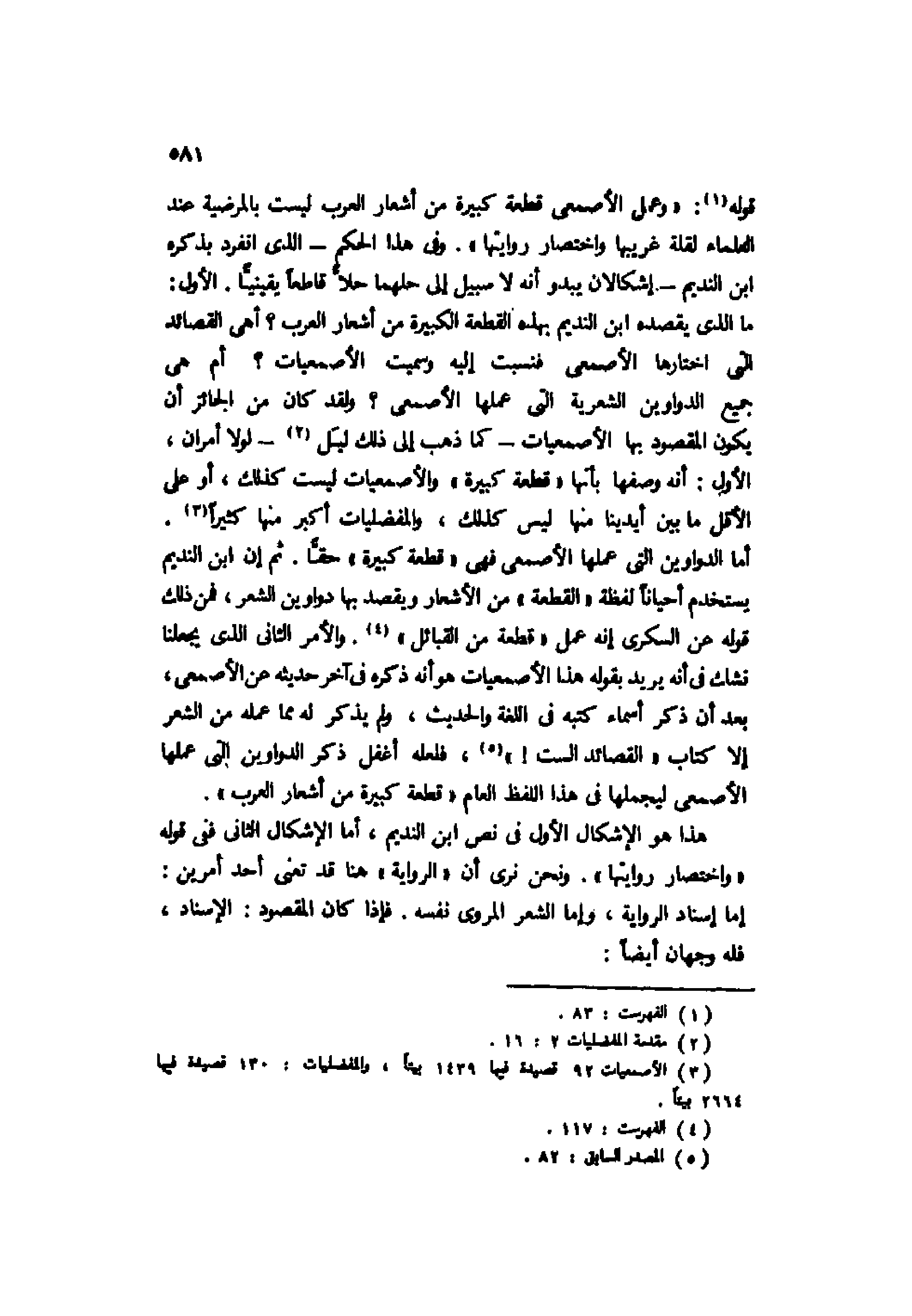 قوله1: "وعمل الأصمعي قطعة كبيرة من أشعار العرب ليست بالمرضية عند العلماء لقلة غريبها واختصار روايتها". وفي هذا الحكم -الذي انفرد بذكره ابن النديم- إشكالان يبدو أنه لا سبيل إلى حلهما حلًّا قاطعًا يقينيًّا. الأول: ما الذي يقصده ابن النديم بهذه القطعة الكبيرة من أشعار العرب؟ أهي القصائد التي اختارها الأصمعي فنسبت إليه وسميت الأصمعيات؟ أم هي جميع الدواوين الشعرية التي عملها الأصمعي؟ ولقد كان من الجائز أن يكون المقصود بها الأصمعيات -كما ذهب إلى ذلك ليل2- لولا أمران، الأول: أنه وصفها بأنها "قطعة كبيرة" والأصمعيات ليست كذلك، أو على الأقل ما بين أيدينا منها ليس كذلك، والمفضليات أكبر منها كثيرًا3.