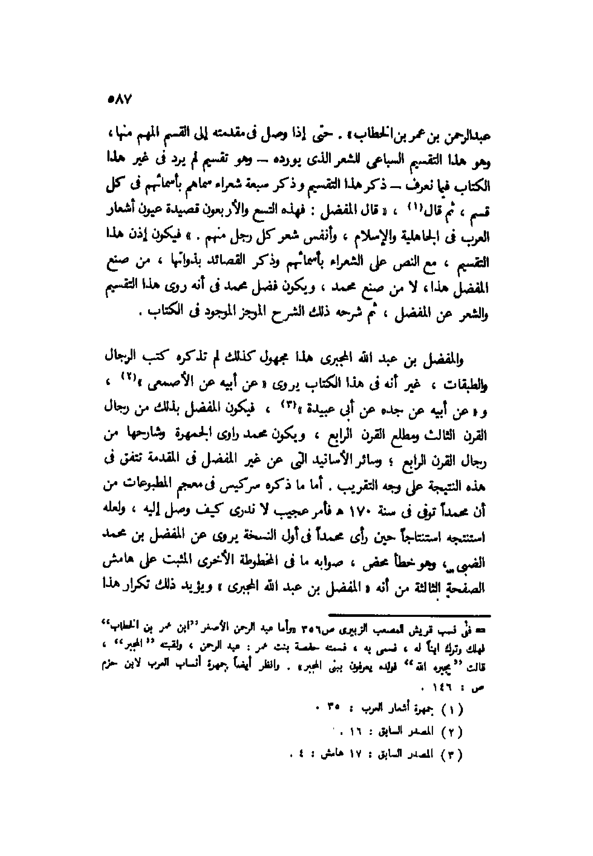 عبد الرحمن بن عمر بن الخطاب". حتى إذا وصل في مقدمته إلى القسم المهم منها، وهو هذا القسم السباعي للشعر الذي يورده -وهو تقسيم لم يرد في غير هذا الكتاب فيما نعرف- ذكر هذا التقسيم وذكر سبعة شعراء سماهم بأسمائهم في كل قسم، ثم قال1، "قال المفضل: فهذه التسع والأربعون قصيدة عيون أشعار العرب في الجاهلية والإسلام، وأنفس شعر كل رجل منهم" فيكون إذن هذا التقسيم، مع النص على الشعراء بأسمائهم وذكر القصائد بذواتها، من صنع المفضل هذا، لا من صنع محمد، ويكون فضل محمد في أنه روى هذا التقسيم والشعر عن المفضل، ثم شرحه ذلك الشرح الموجز الموجود في الكتاب.