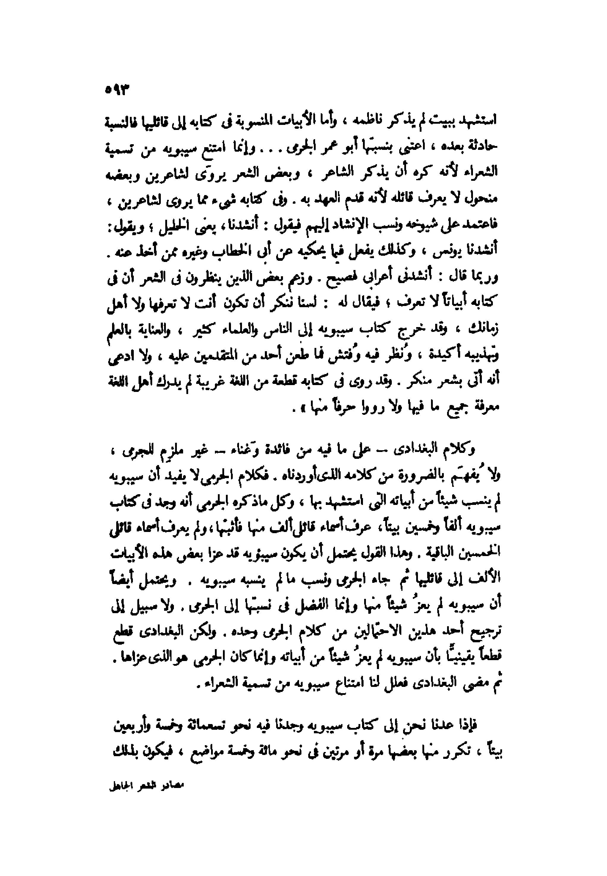 وكلام البغدادي -على ما فيه من فائدة وغناء- غير ملزم للجرمي، ولا يفهم بالضرورة من كلامه الذي أوردناه. فكلام الجرمي لا يفيد أن سيبويه لم ينسب شيئًا من أبياته التي استشهد بها، وكل ما ذكره الجرمي أنه وجد في كتاب سيبويه ألفًا وخمسين بيتًا، عرف أسماء قائلي ألف منها فأثبتها، ولم يعرف أسماء قائلي الخمسين الباقية. وهذا القول يحتمل أن يكون سيبويه قد عزا بعض هذه الأبيات الألف إلى قائليها ثم جاء الجرمي ونسب ما لم ينسبه سيبويه. ويحتمل أيضًا أن سيبويه لم يعز شيئًا منها وإنما الفضل في نسبتها إلى الجرمي. ولا سبيل إلى ترجيح أحد هذين الاحتمالين من كلام الجرمي وحده. ولكن البغدادي قطع قطعًا يقينيًّا بأن سيبويه لم يعز شيئًا من أبياته وإنما كان الجرمي هو الذي عزاها. ثم مضى البغدادي فعلل لنا امتناع سيبويه من تسمية الشعراء.