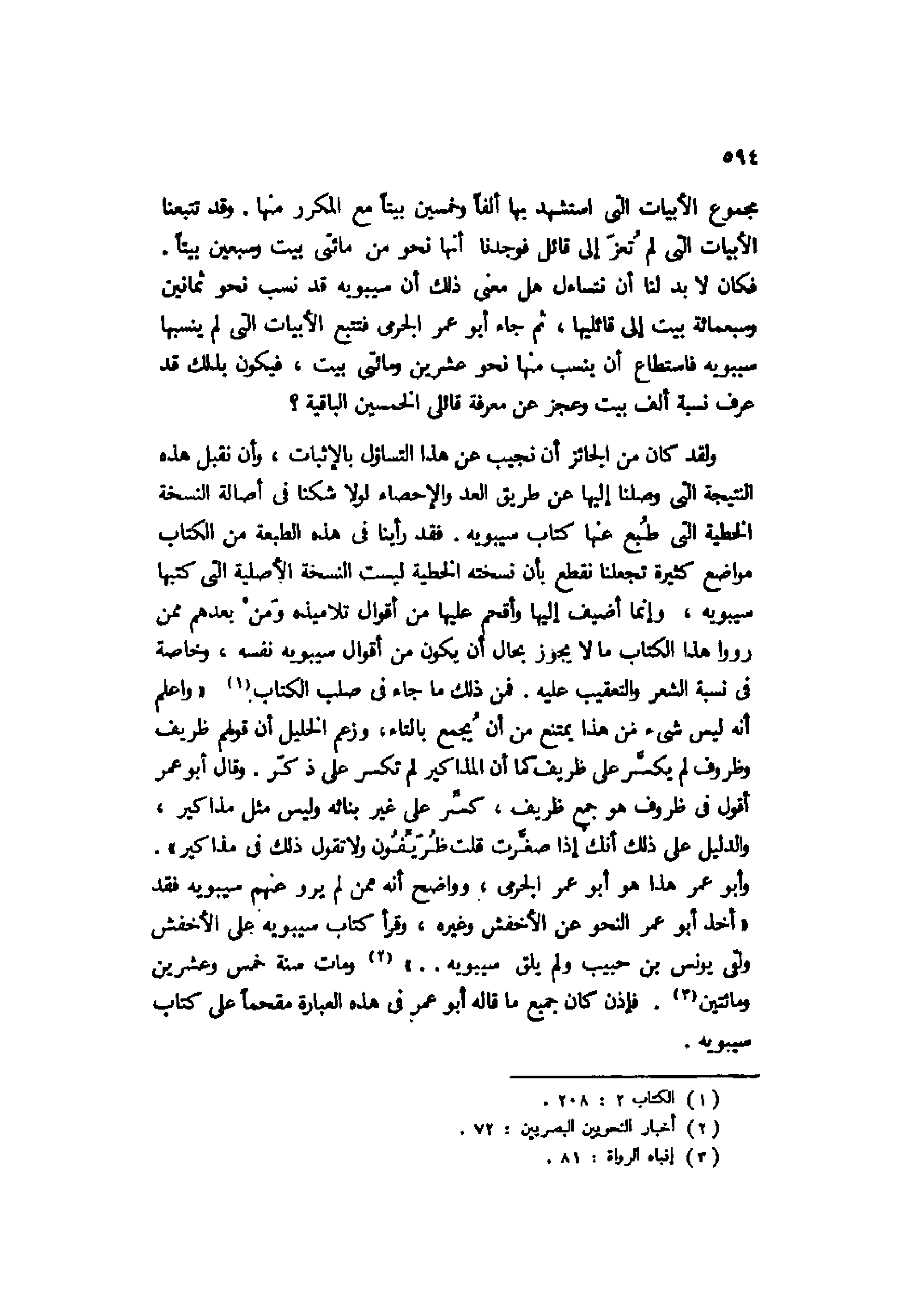 ولقد كان من الجائز أن نجيب عن هذا التساؤل بالإثبات، وأن نقبل هذه النتيجة التي وصلنا إليها عن طريق العد والإحصاء لولا شكنا في أصالة النسخة الخطية التي طبع عنها كتاب سيبويه. فقد راينا في هذه الطبعة من الكتاب مواضع كثيرة تجعلنا نقطع بأن نسخته الخطية ليست النسخة الأصلية التي كتبها سيبويه، وإنما أضيف إليها وأقحم عليها من أقوال تلاميذه ومَنْ بعدهم ممن رووا هذا الكتاب ما لا يجوز بحال أن يكون من أقوال سيبويه نفسه، وخاصة في نسبة الشعر والتعقيب عليه. فمن ذلك ما جاء في صلب الكتاب1 "واعلم أنه ليس شيء من هذا يمتنع من أن يجمع بالتاء، وزعم الخليل أن قولهم ظريف وظروف لم يكسر على طريف كما أن المذاكير لم تكسر على ذكر. وقال أبو عمر أقول في ظروف هو جمع ظريف، كسر على غير بنائه وليس مثل مذاكير، والدليل على ذلك أنك إذا صغرت قلت ظُرَيِّفُون ولا تقول ذلك في مذاكير". وأبو عمر هذا هو أبو عمر الجرمي، وواضح أنه ممن لم يرو عنهم سيبويه فقد "أخذ أبو عمر النحو عن الأخفش وغيره، وقرأ كتاب سيبويه على الأخفش ولقي يونس بن حبيب ولم يلق سيبويه.."2 ومات سنة خمس وعشرين ومائتين3. فإذن كان جميع ما قاله أبو عمر في هذه العبارة مقحمًا على كتاب سيبويه.
