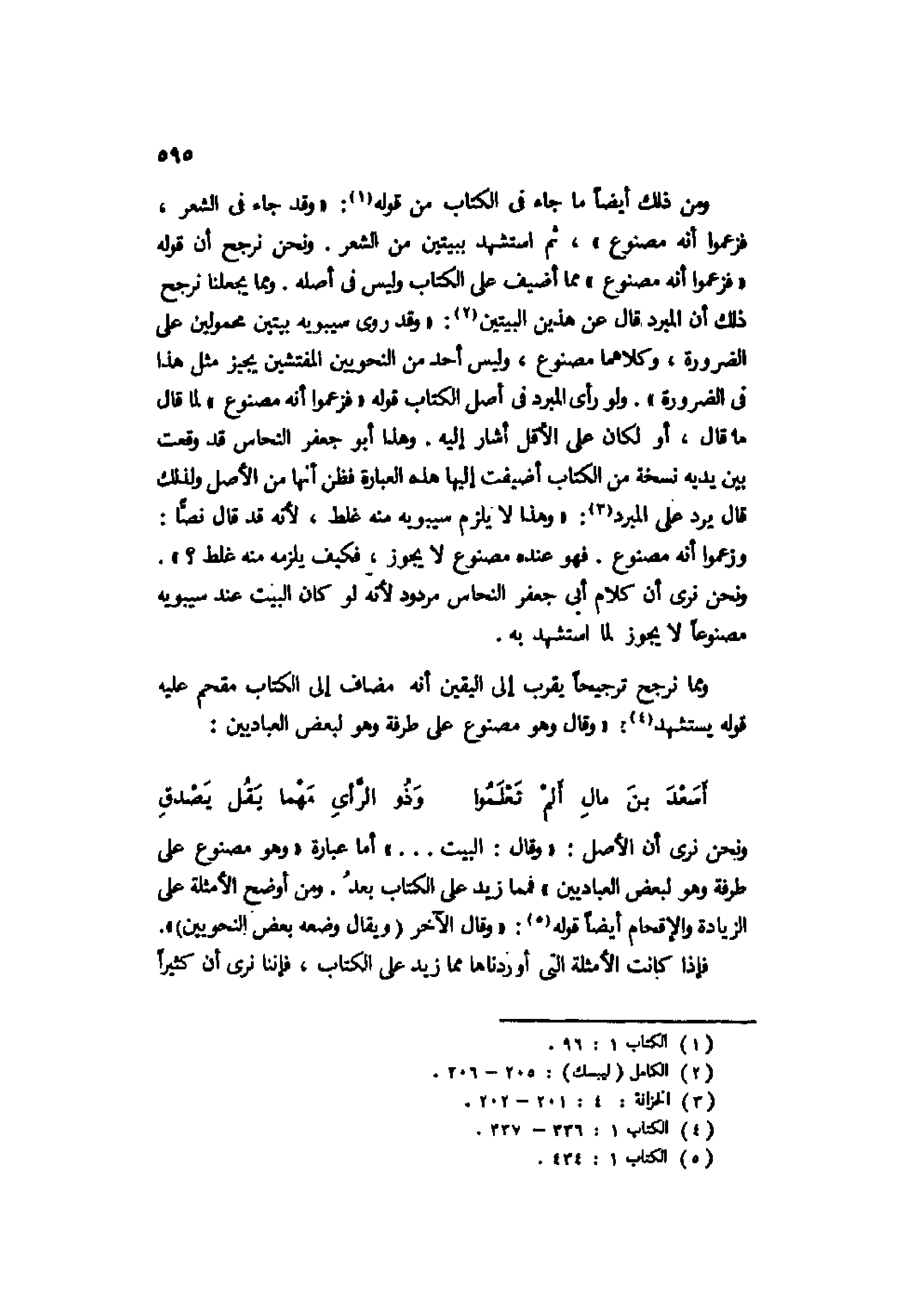 ومن ذلك أيضًا ما جاء في الكتاب من قوله1: "وقد جاء في الشعر، فزعموا أنه مصنوع"، ثم استشهد ببيتين من الشعر. ونحن نرجح أن قوله "فزعموا أنه مصنوع" مما أضيف على الكتاب وليس في أصله. ومما يجعلنا نرجح ذلك أن المبرد قال عن هذين البيتين2: "وقد روى سيبويه بيتين محمولين على الضرورة، وكلاهما مصنوع، وليس أحد من النحويين المفتشين يجيز مثل هذا في الضرورة". ولو رأى المبرد في أصل الكتاب قوله "فزعموا أنه مصنوع" لما قال ما قال، أو لكان على الأقل أشار إليه. وهذا أبو جعفر النحاس قد وفعت بين يديه نسخة من الكتاب أضيفت إليها هذه العبارة فظن أنها من الأصل ولذلك قال يرد على المبرد3: "وهذا لا يلزم سيبويه منه غلط؛ لأنه قد قال نصًّا: وزعموا أنه مصنوع. فهو عنده مصنوع لا يجوز، فكيف يلزمه منه غلط؟ ".