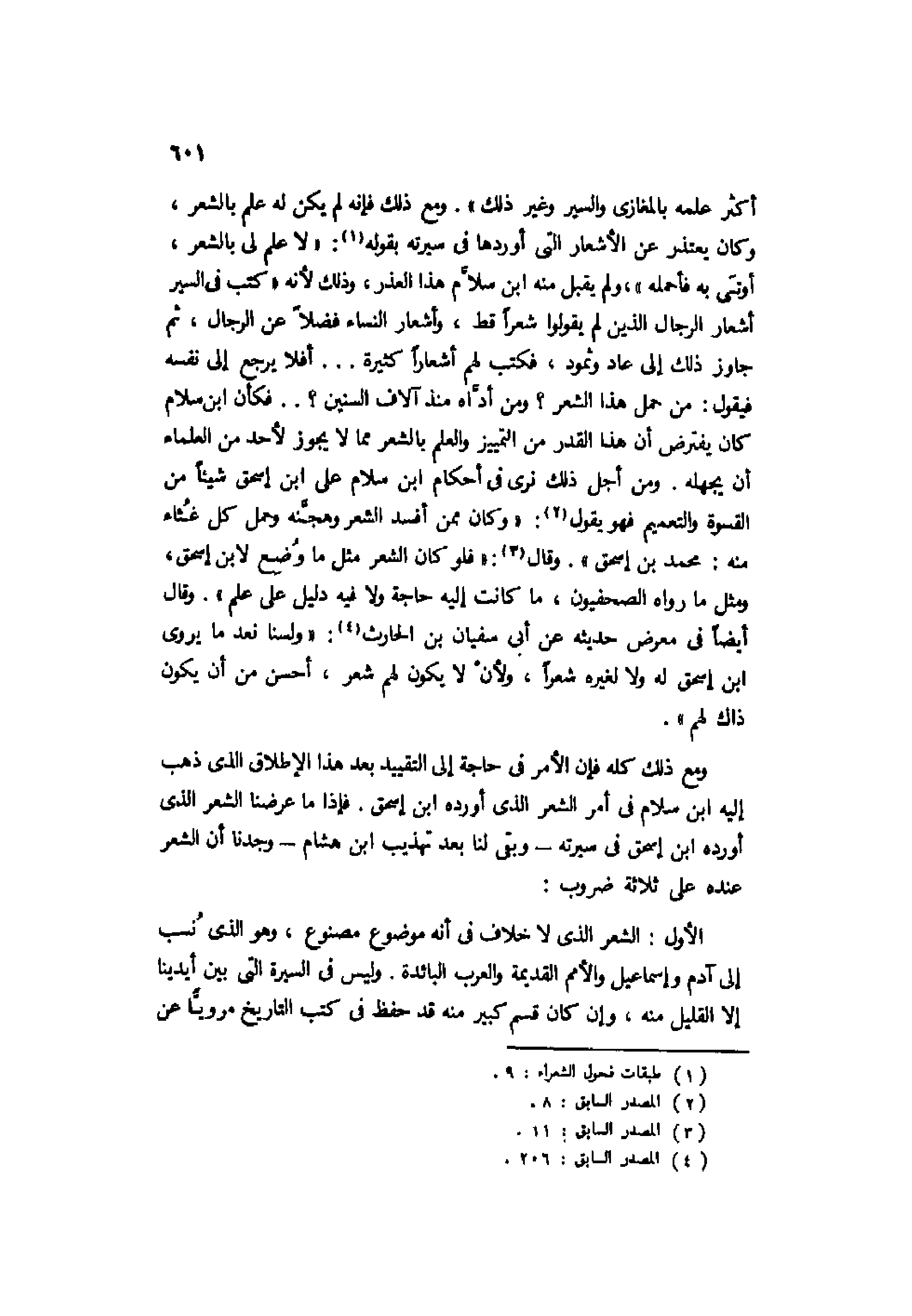 ومع ذلك كله فإن الأمر في حاجة إلى التقييد بعد هذا الإطلاق الذي ذهب إليه ابن سلام في أمر الشعر الذي أورده ابن إسحاق. فإذا ما عرضنا الشعر الذي أورده ابن إسحاق في سيرته -وبقي لنا بعد تهذيب ابن هشام- وجدنا أن الشعر عنده على ثلاثة ضروب:
