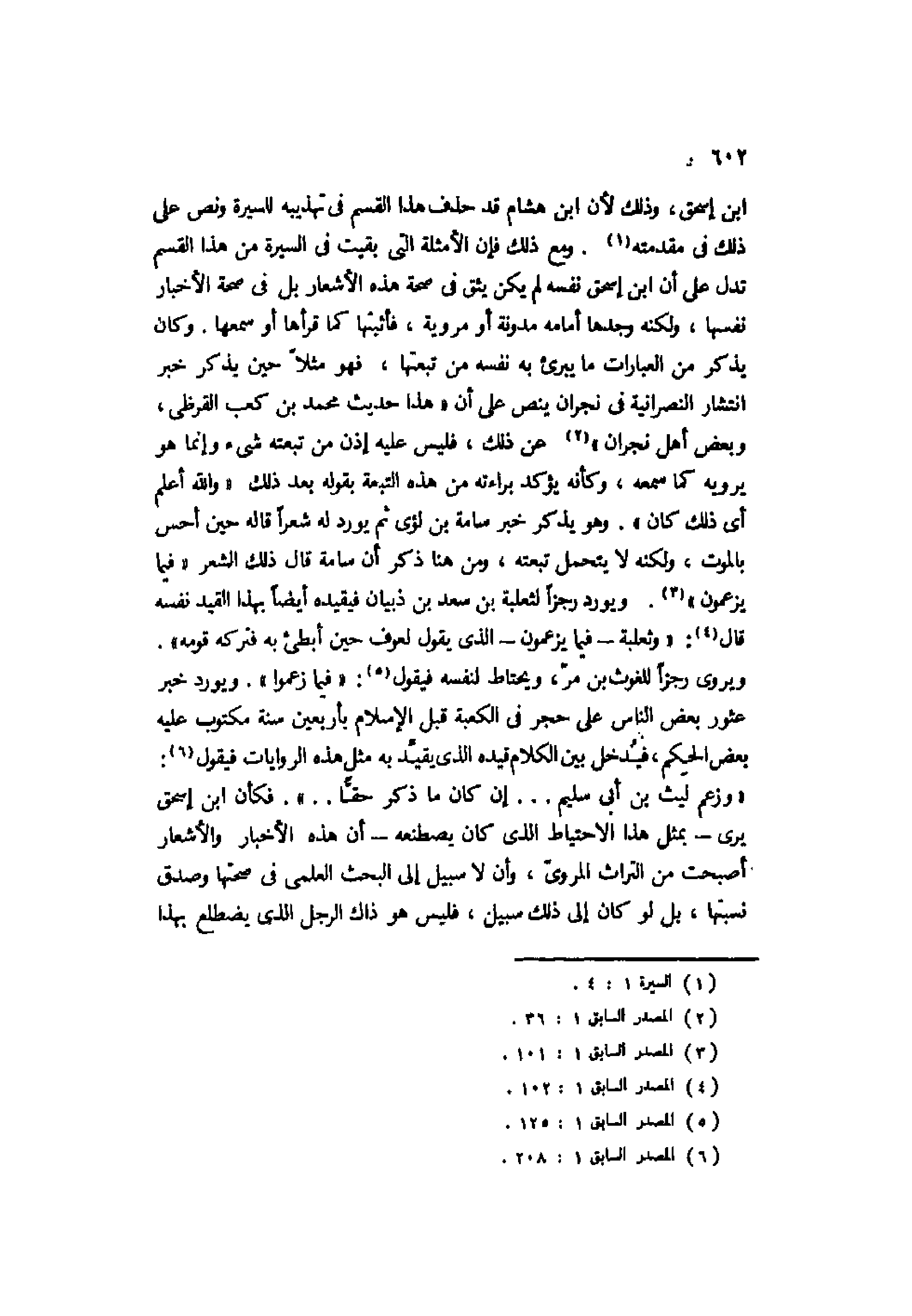 ابن إسحاق، وذلك لأن ابن هشام قد حذف هذا القسم في تهذيبه للسيرة ونص على ذلك في مقدمته1. ومع ذلك فإن الأمثلة التي بقيت في السيرة من هذا القسم تدل على أن ابن إسحاق نفسه لم يكن يثق في صحة هذه الأشعار بل في صحة الأخبار نفسها، ولكنه وجدها أمامه مدونة أو مروية، فأثبتها كما قرأها أو سمعها. وكان يذكر من العبارات ما يبرئ به نفسه من تبعتها، فهو مثلًا حين يذكر خبر انتشار النصرانية في نجران ينص على أن "هذا حديث محمد بن كعب القرظي، وبعض أهل نجران"2 عن ذلك، فليس عليه إذن من تبعته شيء وإنما هو يرويه كما سمعه، وكأنه يؤكد براءته من هذه التبعة بقوله بعد ذلك "والله أعلم أي ذلك كان". وهو يذكر خبر سامة بن لؤي ثم يورد له شعرًا قاله حين أحس بالموت، ولكنه لا يتحمل تبعته، ومن هنا ذكر أن سامة قال ذلك الشعر "فيما يزعمون"3. ويورد رجزًا لثعلبة بن سعد بن ذبيان فيقيده أيضًا بهذا القيد نفسه قال4: "وثعلبة -فيما يزعمون- الذي يقول لعوف حين أبطئ به فتركه قومه".