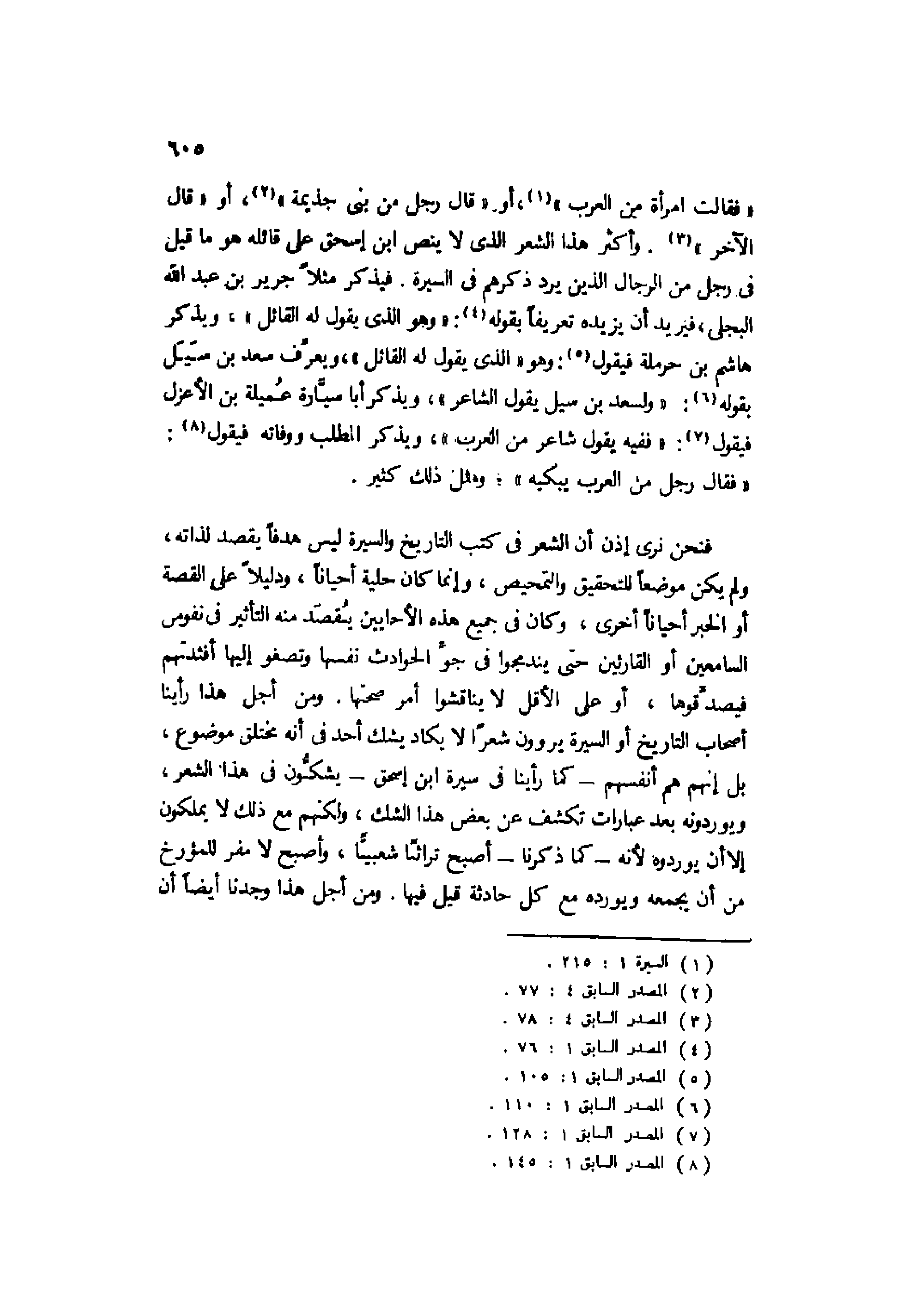فنحن نرى إذن أن الشعر في كتب التاريخ والسيرة ليس هدفًا يقصد لذاته، ولم يكن موضعًا للتحقيق والتمحيص، وإنما كان حلية أحيانًا، ودليلًا على القصة أو الخبر أحيانًا أخرى، وكان في جميع هذه الأحايين يُقصد منه التأثير في نفوس السامعين أو القارئين حتى يندمجوا في جو الحوادث نفسها وتصغو إليها أفئدتهم فيصدقوها، أو على الأقل لا يناقشوا أمر صحتها. ومن أجل هذا رأينا أصحاب التاريخ أو السيرة يروون شعرًا لا يكاد يشك أحد في انه مختلق موضوع، بل إنهم هم أنفسهم -كما رأينا في سيرة ابن إسحاق- يشكون في هذا الشعر، ويوردونه بعد عبارات تكشف عن بعض هذا الشك، ولكنهم مع ذلك لا يملكون إلا أن يوردوه لأنه -كما ذكرنا- أصبح تراثًا شعبيًّا، وأصبح لا مفر للمؤرخ من أن يجمعه ويورده مع كل حادثة قيل فيها. ومن أجل هذا وجدنا أيضًا أن