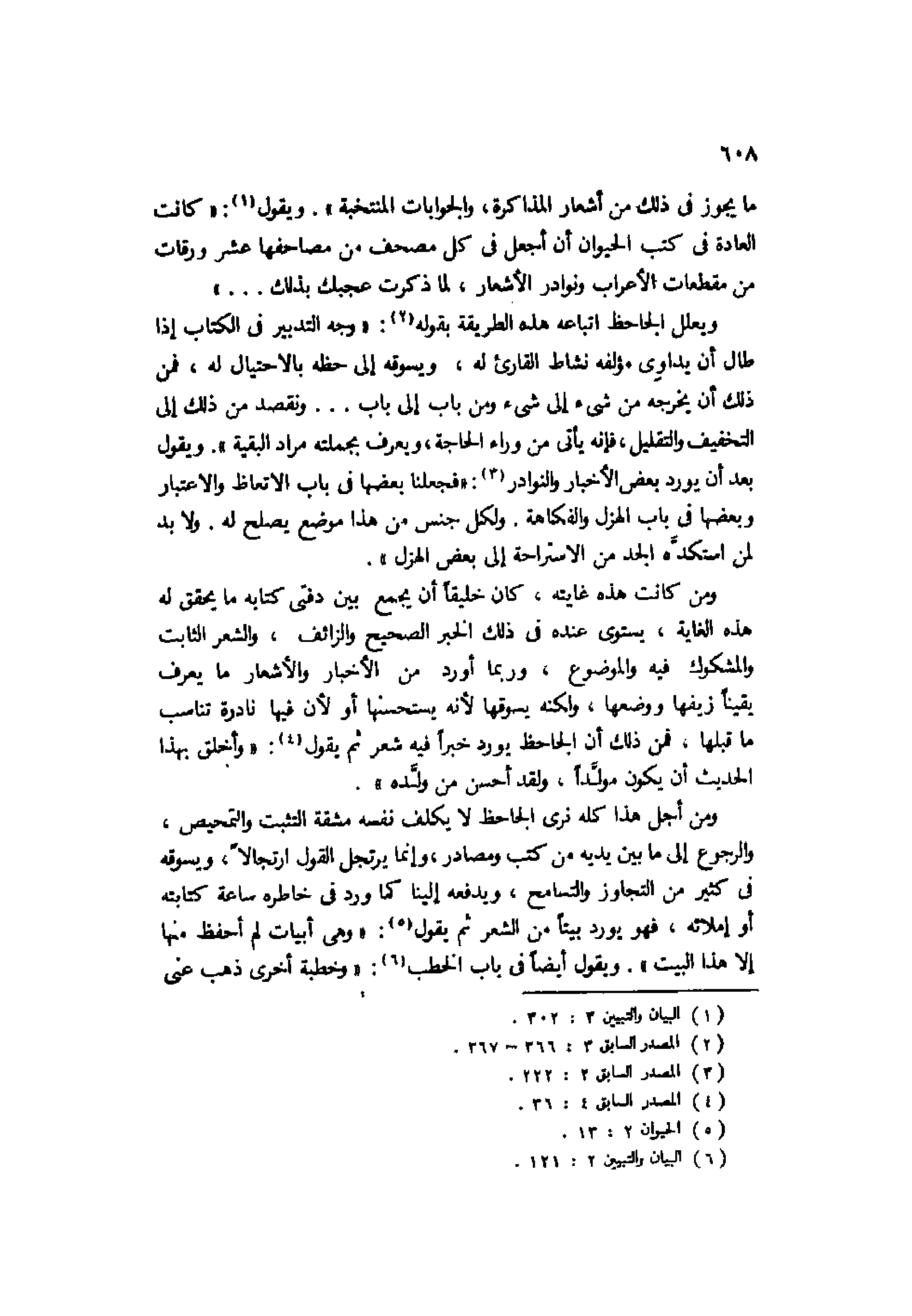 ومن أجل هذا كله نرى الجاحظ لا يكلف نفسه مشقة التثبت والتمحيص، والرجوع إلى ما بين يديه من كتب ومصادر، وإنما يرتجل القول ارتجالًا، ويسوقه في كثير من التجاوز والتسامح، ويدفعه إلينا كما ورد في خاطره ساعة كتابته أو إملائه، فهو يورد بيتًا من الشعر ثم يقول5: "وهي أبيات لم أحفظ منها إلا هذا البيت". ويقول أيضًا في باب الخطب6: "وخطبة أخرى ذهب عني