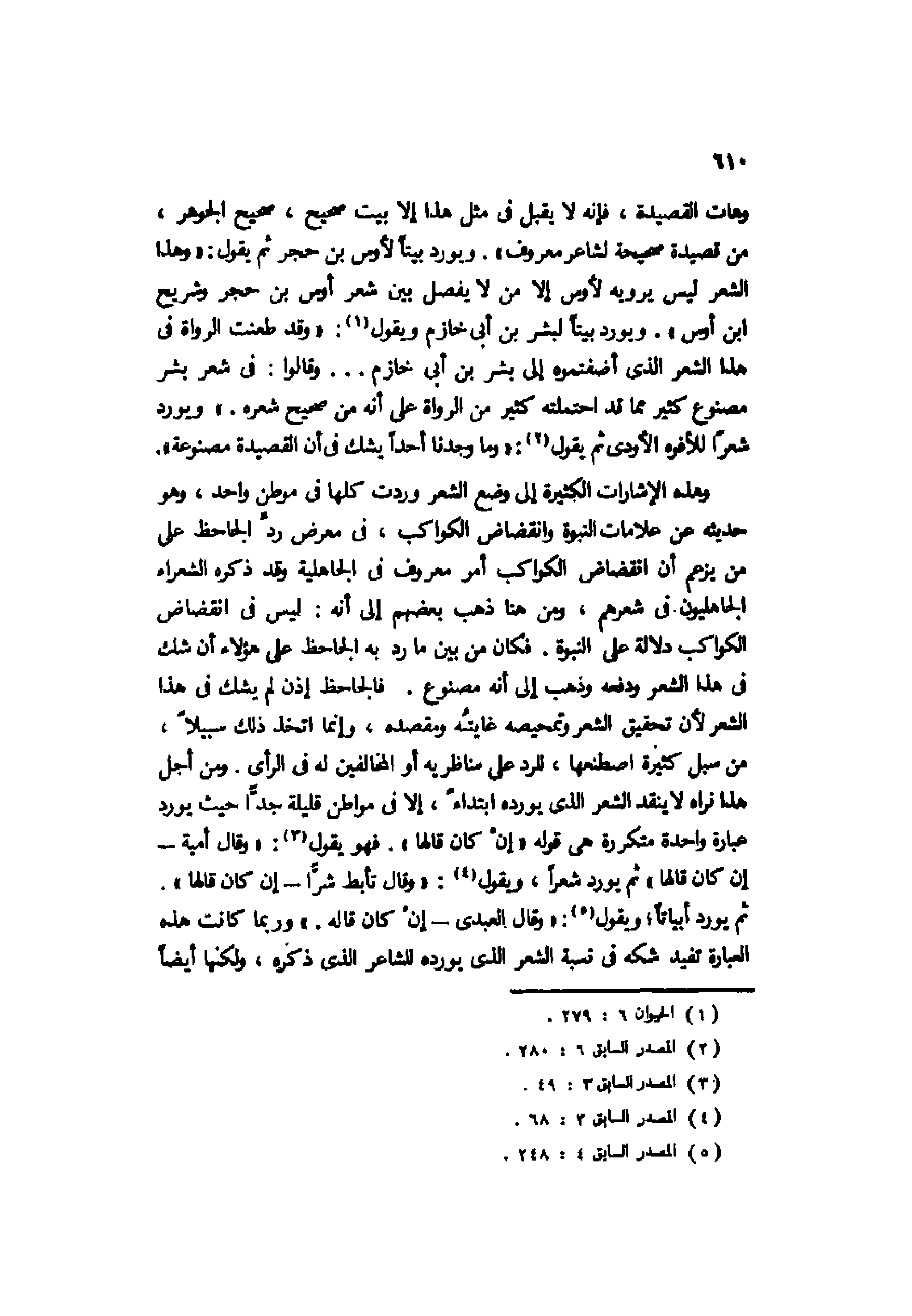وهذه الإشارات الكثيرة إلى وضع الشعر وردت كلها في موطن واحد، وهو حديثه عن علامات النبوة وانقضاض الكواكب، وفي معرض رد الجاحظ على من يزعم أن انقضاض الكواكب أمر معروف في الجاهلية وقد ذكره الشعراء الجاهليون في شعرهم، ومن هنا ذهب بعضهم إلى أنه: ليس في انقضاض الكواكب دلالة على النبوة. فكان من بين ما رد به الجاحظ على هؤلاء أن شك في هذا الشعر ودفعه وذهب إلى أنه مصنوع. فالجاحظ إذن لم يشك في هذا الشعر لأن تحقيق الشعر وتمحيصه غايته ومقصده، وإنما اتخذ ذلك سبيلًا، من سبل كثيرة اصطنعها، للرد على مناظريه أو المخالفين له في الرأي. ومن أجل هذا نراه لا ينقد الشعر الذي يورده ابتداء، إلا في مواطن قليلة جدًّا حيث يورد عبارة واحدة متكررة هي قوله: "إن كان قالها". فهو يقول3: "وقال أمية -إن كان قالها-" ثم يورد شعرًا، ويقول4: "وقال تأبط شرًّا -إن كان قالها-".