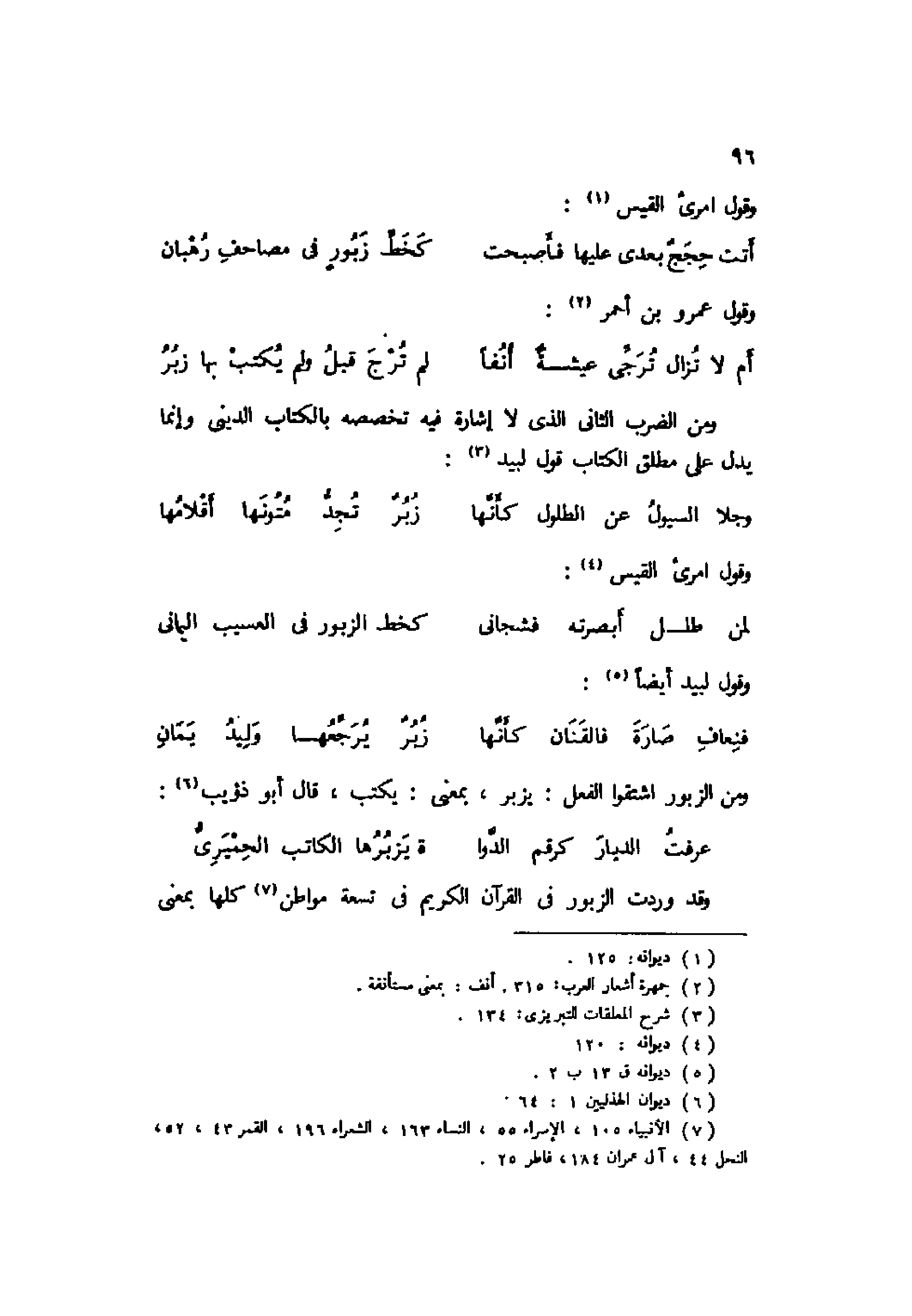 ومن الزبور اشتقوا الفعل: يزبر، بمعنى: يكتب، قال أبو ذؤيب6:
