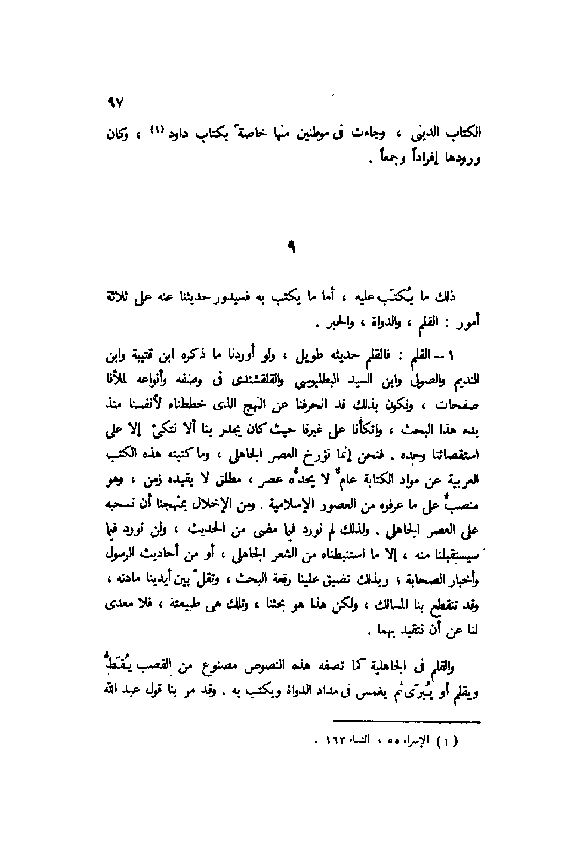 1- القلم: فالقلم حديثه طويل، ولو أوردنا ما ذكره ابن قتيبة وابن النديم والصولي وابن السيد البطليوسي والقلقشندي في وصفه وأنواعه لملأنا صفحات، ونكون بذلك قد انحرفنا عن النهج الذي خططناه لأنفسنا منذ بدء هذا البحث، واتكأنا على غيرنا حيث كان يجدر بنا ألا نتكئ إلا على استقصائنا وحده. فنحن إنما نؤرخ العصر الجاهلي، وما كتبته هذه الكتب العربية عن مواد الكتابة عام لا يحده عصر، مطلق لا يقيده زمن، وهو منصب على ما عرفوه من العصور الإسلامية. ومن الإخلال بمنهجنا أن نسحبه على العصر الجاهلي. ولذلك لم نورد فيما مضى من الحديث، ولن نورد فيما سيستقبلنا منه، إلا ما استنبطناه من الشعر الجاهلي، أو من أحاديث الرسول وأخبار الصحابة، وبذلك تضيق علينا رقعة البحث، وتقل بين أيدينا مادته، وقد تنقطع بنا المسالك، ولكن هذا هو بحثنا، وتلك هي طبيعته، فلا معدى لنا عن أن نتقيد بهما.