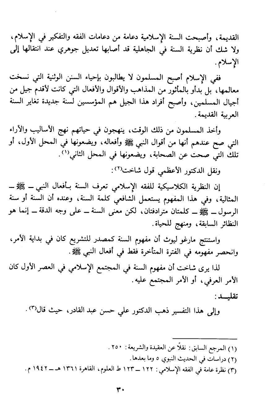 القديمة، وأصبحت السُنَّة الإسلامية دعامات الفقه والتفكير في الإسلام، ولا شك أنَّ نظرية السُنَّة في الجاهلية قد أصابها تعديل جوهريٌّ عند انتقالها إلى الإسلام.