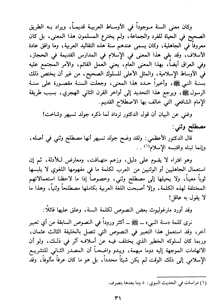 وقد أورد مرغليوث بعض النصوص لكلمة السُنَّة، وعلَّقَ عليها قائلاً: