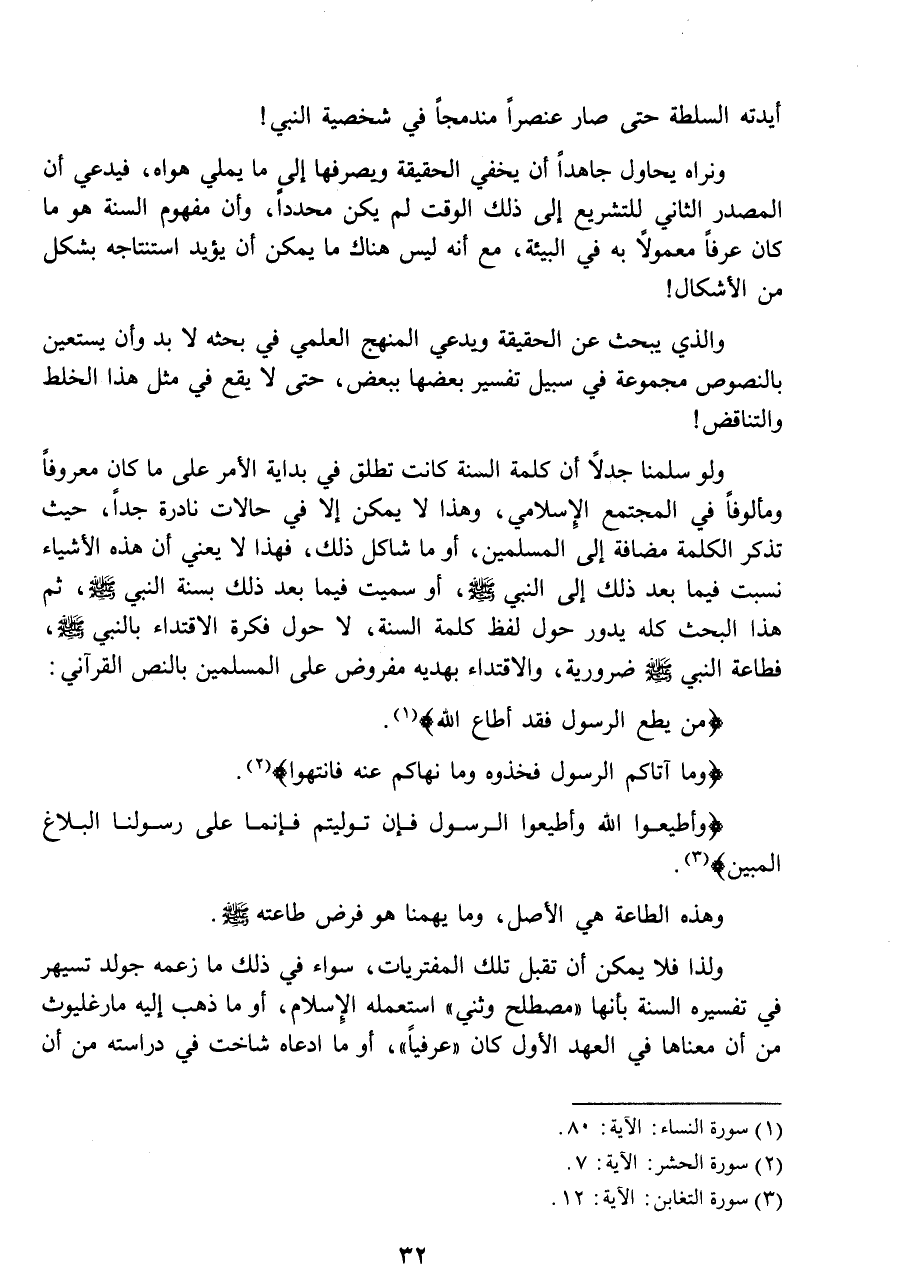 ولو سلَّمنا جَدَلاً أنَّ كلمة السُنَّة كانت تطلق في بداية الأمر على ما كان معروفاً ومألوفاً في المجتمع الإسلامي، وهذا لا يمكن إلاَّ في حالات نادرة جداً، حيث تذكر الكلمة مضافة إلى المسلمين، أو ما شاكل ذلك، فهذا لا يعني أنَّ هذه الأشياء نسبت فيما بعد ذلك إلى النبي - صَلََّى اللهُ عَلَيْهِ وَسَلَّمَ -، أو سُمِّيَتْ فيما بعد ذلك بسُنَّة النبي - صَلََّى اللهُ عَلَيْهِ وَسَلَّمَ -، ثم هذا البحث كله يدور حول لفظ كلمة السُنَّة، لا حول فكرة الاقتداء بالنبي - صَلََّى اللهُ عَلَيْهِ وَسَلَّمَ -، فطاعة النبي - صَلََّى اللهُ عَلَيْهِ وَسَلَّمَ - ضرورية، والاقتداء بهديه مفروض على المسلمين بالنص القرآني: