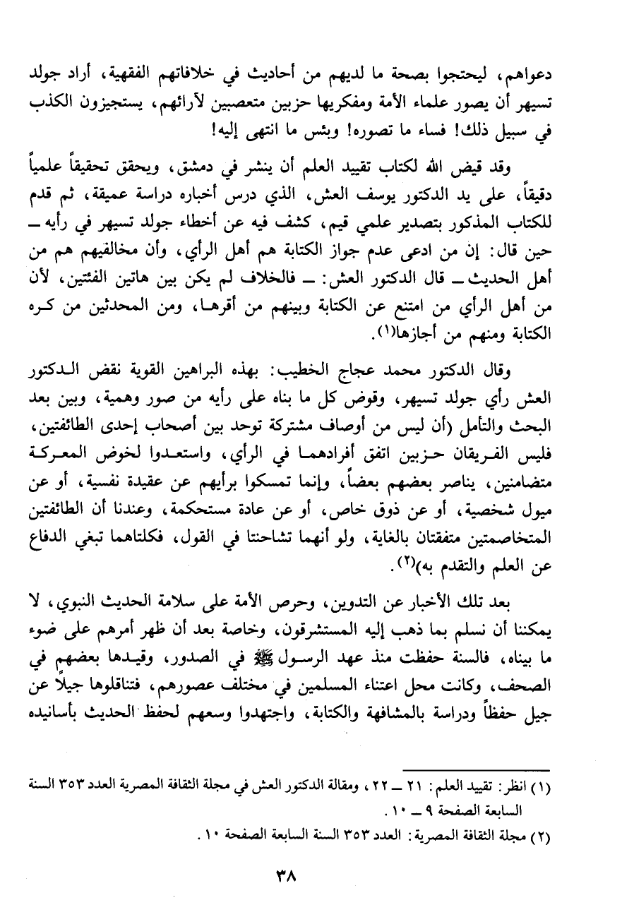 وقال الدكتور محمد عجاج الخطيب: «بهذه البراهين القوية نقض الدكتور العش رأي جُولْدْتسِيهِرْ، وقوَّض كل ما بناهُ على رأيه من صور وهمية، وبَيَّنَ بعد البحث والتأمل (أنْ ليس من أوصاف مشتركة تُوَحِّدُ بين أصحاب إحدى الطائفتين، فليس الفريقان حزبين اتفق أفرادهما في الرأي، واستعدُّوا لخوض المعركة متضامنين، يناصر بعضهم بعضاً، وإنما تمسَّكُوا برأيهم عن عقيدة نفسية، أو عن ميول شخصية، أو عن ذوق خاص، أو عن عادة مُسْتَحْكمة، وعندنا أنَّ الطائفتين المُتخاصمتين مُتَّفقتان بالغاية، ولو أنهما تشاحنتا في القول، فكلتاهما تبغي الدفاع عن العلم والتقدُّم)» (2).