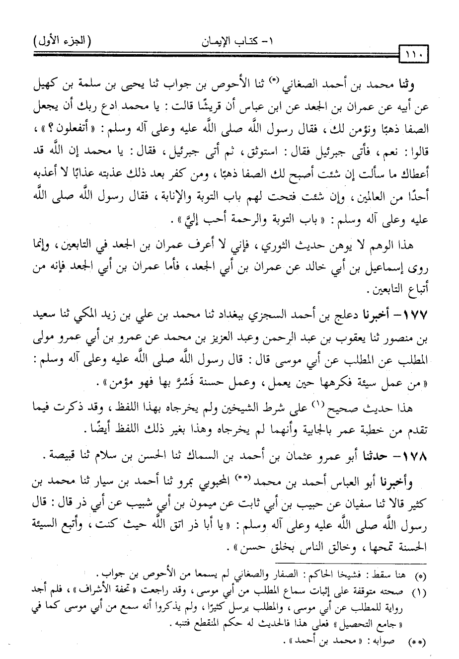 177 - أَخْبَرَنَا دَعْلَجُ بْنُ أَحْمَدَ السِّجْزِيُّ ، بِبَغْدَادَ ، ثنا مُحَمَّدُ بْنُ عَلِيِّ بْنِ زَيْدٍ الْمَكِّيُّ ، ثنا سَعِيدُ بْنُ مَنْصُورٍ ، ثنا يَعْقُوبُ بْنُ عَبْدِ الرَّحْمَنِ ، وَعَبْدُ الْعَزِيزِ بْنُ مُحَمَّدٍ ، عَنْ عَمْرِو بْنِ أَبِي عُمَرَ ، وَمَوْلَى الْمُطَّلِبِ ، عَنْ أَبِي مُوسَى ، قَالَ: قَالَ رَسُولُ اللَّهِ صَلَّى اللَّهُ عَلَيْهِ وَسَلَّمَ: " مَنْ عَمِلَ سَيِّئَةً فَكَرِهَهَا حِينَ يَعْمَلُ وَعَمِلَ حَسَنَةً فَسُرَّ بِهَا فَهُوَ مُؤْمِنٌ " .
