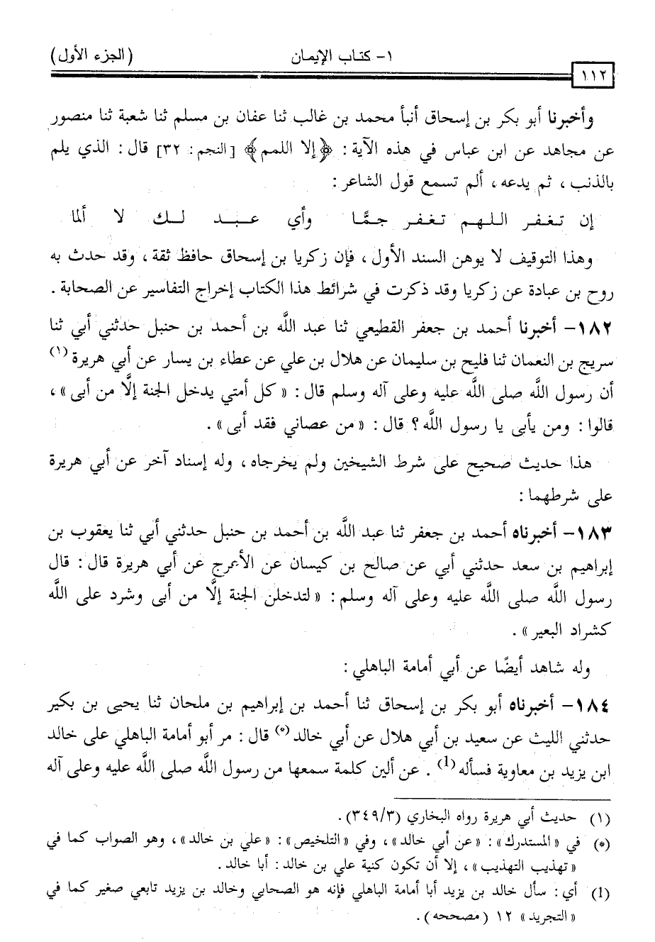 183 - أَخْبَرْنَاهُ أَحْمَدُ بْنُ جَعْفَرٍ ، ثنا عَبْدُ اللَّهِ بْنُ أَحْمَدَ بْنِ حَنْبَلٍ ، حَدَّثَنِي أَبِي ، ثنا يَعْقُوبُ بْنُ إِبْرَاهِيمَ بْنِ سَعْدٍ ، حَدَّثَنِي أَبِي ، عَنْ صَالِحِ بْنِ كَيْسَانَ ، عَنِ الْأَعْرَجِ ، عَنْ أَبِي هُرَيْرَةَ ، قَالَ: قَالَ رَسُولُ اللَّهِ صَلَّى اللَّهُ عَلَيْهِ وَسَلَّمَ: " لَتَدْخُلُنَّ الْجَنَّةَ إِلَّا مَنْ أَبَى وَشَرَدَ عَلَى اللَّهِ كَشِرَادِ الْبَعِيرِ " . وَلَهُ شَاهِدٌ أَيْضًا ، عَنْ أَبِي أُمَامَةَ الْبَاهِلِيِّ