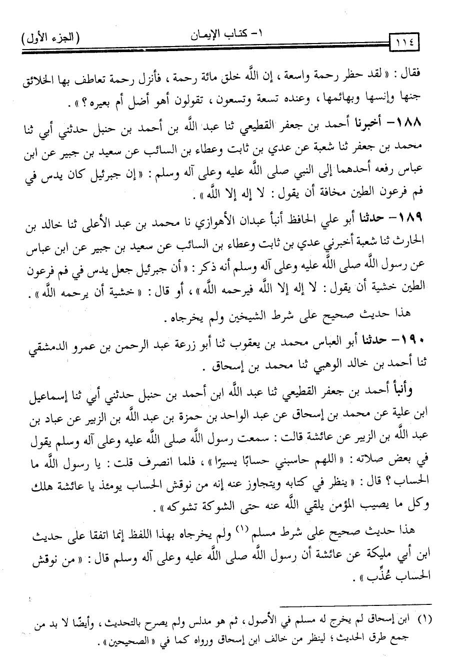 190 - حَدَّثَنَا أَبُو الْعَبَّاسِ مُحَمَّدُ بْنُ يَعْقُوبَ ، ثنا أَبُو زُرْعَةَ عَبْدُ الرَّحْمَنِ بْنُ عَمْرٍو الدِّمَشْقِيُّ ، ثنا أَحْمَدُ بْنُ خَالِدٍ الْوَهْبِيُّ ، ثنا مُحَمَّدُ بْنُ إِسْحَاقَ ، وَأَنْبَأَ أَحْمَدُ بْنُ جَعْفَرٍ الْقَطِيعِيُّ ، ثنا عَبْدُ اللَّهِ بْنُ أَحْمَدَ بْنِ حَنْبَلٍ ، حَدَّثَنِي أَبِي ، ثنا إِسْمَاعِيلُ بْنُ عُلَيَّةَ ، عَنْ مُحَمَّدِ بْنِ إِسْحَاقَ ، عَنْ عَبْدِ الْوَاحِدِ بْنِ حَمْزَةِ بْنِ عَبْدِ اللَّهِ بْنِ الزُّبَيْرِ ، عَنْ عَبَّادِ بْنِ عَبْدِ اللَّهِ بْنِ الزُّبَيْرِ ، عَنْ عَائِشَةَ ، قَالَتْ: سَمِعْتُ رَسُولَ اللَّهِ صَلَّى اللَّهُ عَلَيْهِ وَسَلَّمَ ، يَقُولُ فِي بَعْضِ صَلَاتِهِ: " اللَّهُمَّ حَاسِبْنِي حِسَابًا يَسِيرًا " فَلَمَّا انْصَرَفَ قُلْتُ: يَا رَسُولَ اللَّهِ ، مَا الْحِسَابُ ، قَالَ: " يُنْظَرُ فِي كِتَابِهِ وَيُتَجَاوَزُ عَنْهُ ، إِنَّهُ مَنْ نُوقِشَ الْحِسَابَ يَوْمَئِذٍ يَا عَائِشَةُ هَلَكَ ، وَكُلُّ مَا يُصِيبُ الْمُؤْمِنَ يُلْقِي اللَّهُ عَنْهُ حَتَّى الشَّوْكَةَ تَشُوكُهُ " .