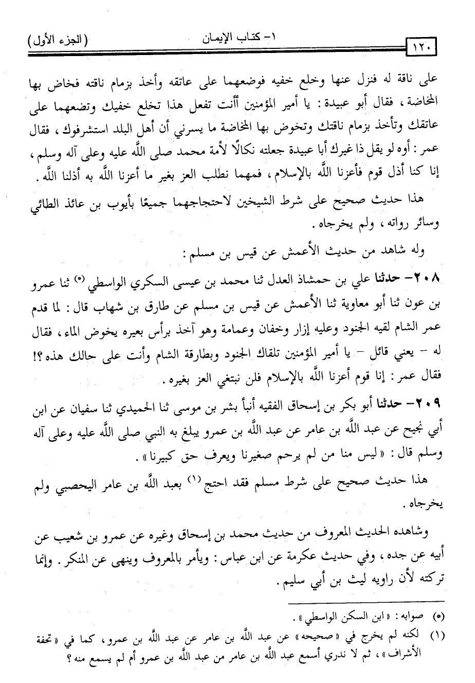 208 - حَدَّثَنَا عَلِيُّ بْنُ حَمْشَاذَ الْعَدْلُ ، ثنا مُحَمَّدُ بْنُ عِيسَى بْنِ السَّكَنِ الْوَاسِطِيُّ ، ثنا عَمْرُو بْنُ عَوْنٍ ، ثنا أَبُو مُعَاوِيَةَ ، ثنا الْأَعْمَشُ ، عَنْ قَيْسِ بْنِ مُسْلِمٍ ، عَنْ طَارِقِ بْنِ شِهَابٍ ، قَالَ: لَمَّا قَدِمَ عُمَرُ الشَّامَ لَقِيَهُ الْجُنُودُ وَعَلَيْهِ إِزَارٌ وَخُفَّانِ وَعِمَامَةٌ وَهُوَ آخِذٌ بِرَأْسِ بَعِيرِهِ يَخُوضُ الْمَاءَ ، فَقَالَ لَهُ - يَعْنِي قَائِلٌ - يَا أَمِيرَ الْمُؤْمِنِينَ تَلْقَاكَ الْجُنُودُ وَبَطَارِقَةُ الشَّامِ وَأَنْتَ عَلَى حَالِكَ هَذَا ؟ فَقَالَ عُمَرُ: " إِنَّا قَوْمٌ أَعَزَّنَا اللَّهُ بِالْإِسْلَامِ ، فَلَنْ نَبْتَغِيَ الْعِزَّةَ بِغَيْرِهِ "