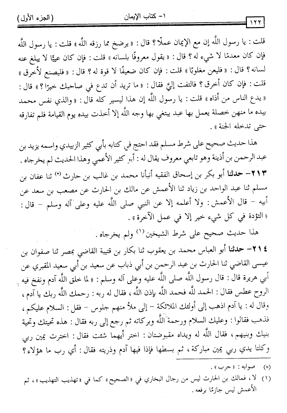 214 - حَدَّثَنَا أَبُو الْعَبَّاسِ مُحَمَّدُ بْنُ يَعْقُوبَ ، ثنا بَكَّارُ بْنُ قُتَيْبَةَ الْقَاضِي ، بِمِصْرَ ، ثنا صَفْوَانُ بْنُ عِيسَى الْقَاضِي ، ثنا الْحَارِثُ بْنُ عَبْدِ الرَّحْمَنِ بْنِ أَبِي ذُبَابٍ ، عَنْ سَعِيدِ بْنِ أَبِي سَعِيدٍ الْمَقْبُرِيِّ ، عَنْ أَبِي هُرَيْرَةَ ، قَالَ: قَالَ رَسُولُ اللَّهِ صَلَّى اللَّهُ عَلَيْهِ وَسَلَّمَ: " لَمَّا خَلَقَ اللَّهُ آدَمَ وَنَفَخَ فِيهِ الرُّوحَ عَطَسَ ، فَقَالَ: الْحَمْدُ لِلَّهِ ، فَحَمِدَ اللَّهَ بِإِذْنِ اللَّهِ ، فَقَالَ لَهُ رَبُّهُ: رَحِمَكَ اللَّهُ رَبُّكَ يَا آدَمُ ، وَقَالَ لَهُ: يَا آدَمُ ، اذْهَبْ إِلَى أُولَئِكَ الْمَلَائِكَةِ إِلَى مَلَأٍ مِنْهُمْ جُلُوسٍ ، فَقُلِ: السَّلَامُ عَلَيْكُمْ ، فَذَهَبَ فَقَالُوا: وَعَلَيْكَ السَّلَامُ وَرَحْمَةُ اللَّهِ وَبَرَكَاتُهُ ، ثُمَّ رَجَعَ إِلَى رَبِّهِ ، فَقَالَ: هَذِهِ تَحِيَّتُكَ وَتَحِيَّةُ بَنِيكَ وَبَنِيهِمْ ، فَقَالَ اللَّهُ لَهُ وَيَدَاهُ مَقْبُوضَتَانِ: اخْتَرْ أَيَّهُمَا شِئْتَ ، فَقَالَ: اخْتَرْتُ يَمِينَ رَبِّي وَكِلْتَا يَدَيْ رَبِّي يَمِينٌ مُبَارَكَةٌ ، ثُمَّ بَسَطَهَا ، فَإِذَا فِيهَا آدَمُ وَذُرِّيَّتُهُ ، فَقَالَ: أَيْ رَبِّ مَا هَؤُلَاءِ ؟ -[123]- قَالَ: ذُرِّيَّتُكَ ، فَإِذَا كُلُّ إِنْسَانٍ مَكْتُوبٌ عُمْرُهُ بَيْنَ عَيْنَيْهِ ، وَإِذَا فِيهِمْ رَجُلٌ أَضْوَؤُهُمْ - أَوْ قَالَ: مِنْ أَضْوَئِهِمْ - لَمْ يُكْتَبْ لَهُ إِلَّا أَرْبَعِينَ سَنَةً ، قَالَ: يَا رَبِّ زِدْ فِي عُمْرِهِ ، قَالَ: ذَاكَ الَّذِي كُتِبَ لَهُ ، قَالَ: فَإِنِّي قَدْ جَعَلْتُ لَهُ مِنْ عُمْرِي سِتِّينَ سَنَةً ، قَالَ: أَنْتَ وَذَاكَ ، قَالَ: ثُمَّ أُسْكِنَ الْجَنَّةَ مَا شَاءَ اللَّهُ ، ثُمَّ أُهْبِطَ مِنْهَا آدَمُ يَعُدُّ لِنَفْسِهِ ، فَأَتَاهُ مَلَكُ الْمَوْتِ ، فَقَالَ لَهُ آدَمُ: قَدْ عَجِلْتَ قَدْ كُتِبَ لِي أَلْفُ سَنَةٍ ، قَالَ: بَلَى ، وَلَكِنَّكَ جَعَلْتَ لِابْنِكَ دَاوُدَ مِنْهَا سِتِّينَ سَنَةً ، فَجَحَدَ فَجَحَدَتْ ذُرِّيَّتُهُ ، وَنَسِيَ فَنَسِيَتْ ذُرِّيَّتُهُ ، فَيَوْمَئِذٍ أُمْرِنَا بِالْكِتَابِ وَالشُّهُودِ " .