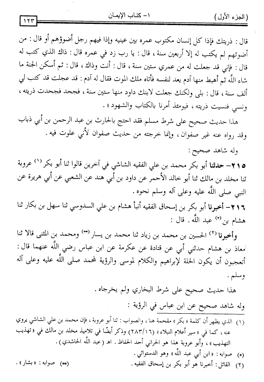 216 - أَخْبَرَنَا أَبُو بَكْرِ بْنُ إِسْحَاقَ الْفَقِيهُ ، أَنْبَأَ هِشَامُ بْنُ عَلِيٍّ السَّدُوسِيُّ ، ثنا سَهْلُ بْنُ بَكَّارٍ ، ثنا هِشَامُ بْنُ عَبْدِ اللَّهِ ، قَالَ: وَأَخْبَرَنَا الْحُسَيْنُ بْنُ مُحَمَّدِ بْنِ زِيَادٍ ، ثنا مُحَمَّدُ بْنُ بَشَّارٍ ، وَمُحَمَّدُ بْنُ الْمُثَنَّى ، قَالَا: ثنا مُعَاذُ بْنُ هِشَامٍ ، حَدَّثَنِي أَبِي ، عَنْ قَتَادَةَ ، عَنْ عِكْرِمَةَ ، عَنِ ابْنِ عَبَّاسٍ رَضِيَ اللَّهُ عَنْهُمَا ، قَالَ: " أَتَعْجَبُونَ أَنْ يَكُونَ الْخُلَّةُ لِإِبْرَاهِيمَ ، وَالْكَلَامُ لِمُوسَى ، وَالرُّؤْيَةُ لِمُحَمَّدٍ صَلَّى اللَّهُ عَلَيْهِ وَسَلَّمَ " .