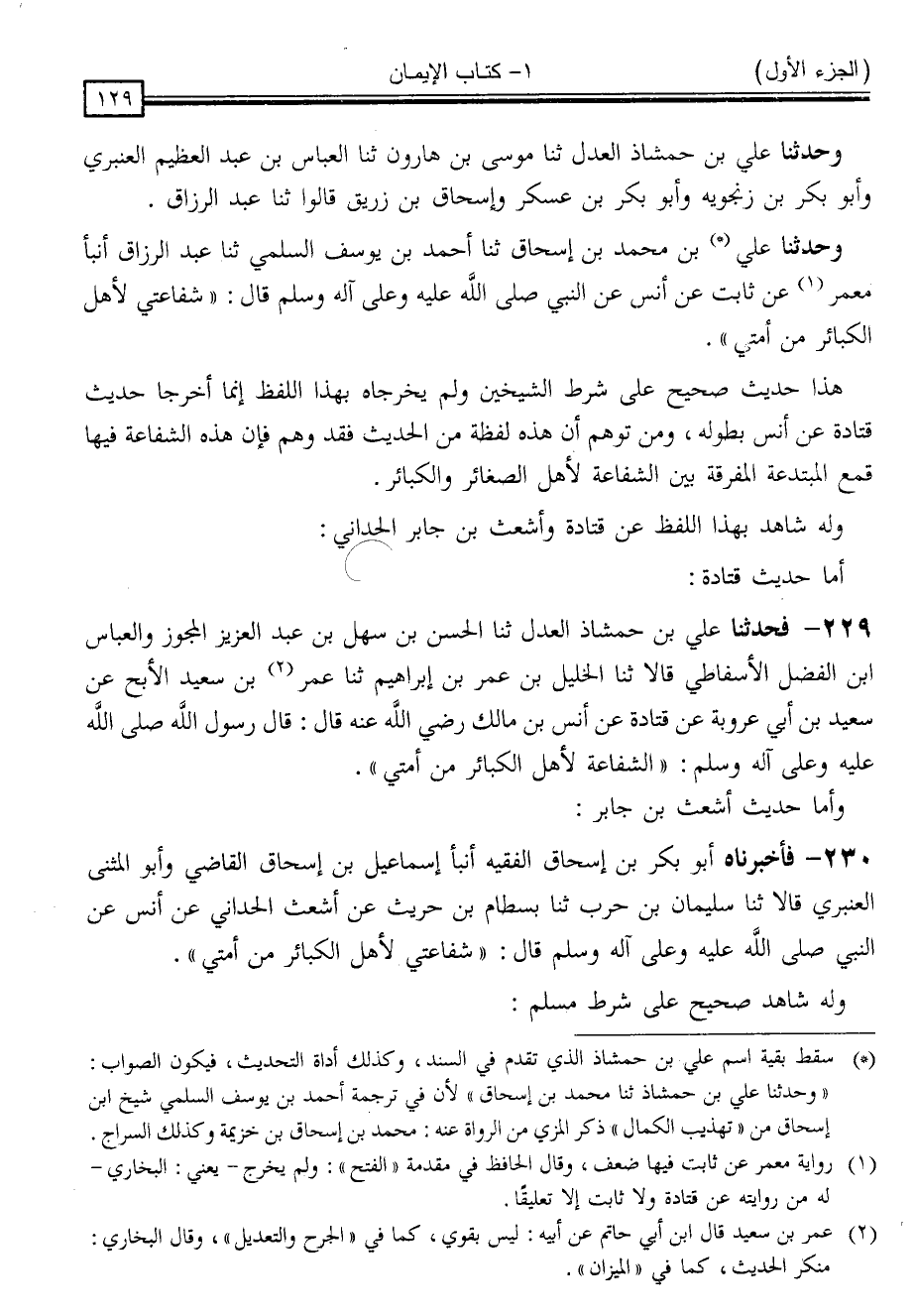 229 - فَحدثنا عَلِيُّ بْنُ حَمْشَاذَ الْعَدْلُ ، ثنا الْحَسَنُ بْنُ سَهْلِ بْنِ عَبْدِ الْعَزِيزِ الْمُجَوَّزُ ، وَالْعَبَّاسُ بْنُ الْفَضْلِ الْأَسْفَاطِيُّ ، قَالَا: ثنا الْخَلِيلُ بْنُ عُمَرَ بْنِ إِبْرَاهِيمَ ، ثنا عُمَرُ بْنُ سَعِيدٍ الْأَبَحُّ ، عَنْ سَعِيدِ بْنِ أَبِي عَرُوبَةَ ، عَنْ قَتَادَةَ ، عَنْ أَنَسِ بْنِ مَالِكٍ رَضِيَ اللَّهُ عَنْهُ ، قَالَ: قَالَ رَسُولُ اللَّهِ صَلَّى اللَّهُ عَلَيْهِ وَسَلَّمَ: " الشَّفَاعَةُ لِأَهْلِ الْكَبَائِرِ مِنْ أُمَّتِي "
