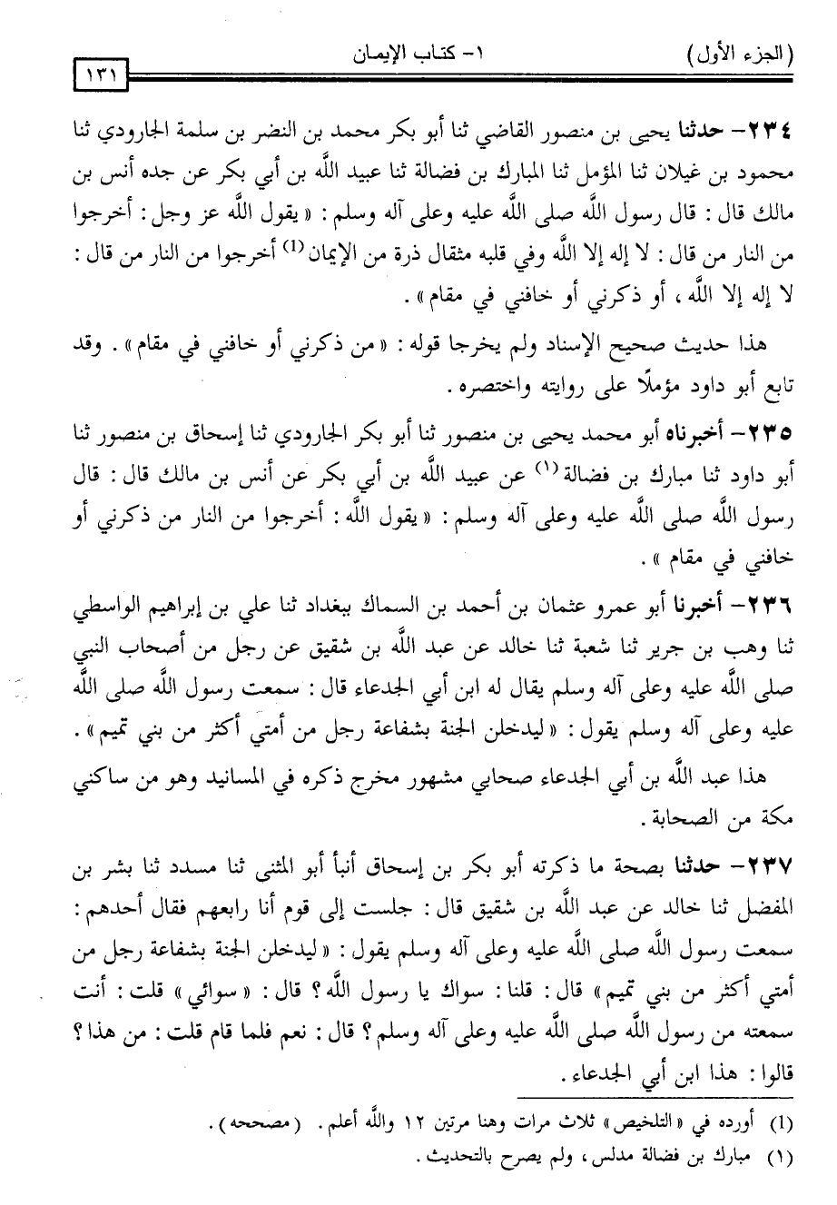 234 - حَدَّثَنَا يَحْيَى بْنُ مَنْصُورٍ الْقَاضِي ، ثنا أَبُو بَكْرٍ مُحَمَّدُ بْنُ النَّضْرِ بْنِ سَلَمَةَ الْجَارُودِيُّ ، ثنا مَحْمُودُ بْنُ غَيْلَانَ ، ثنا الْمُؤَمَّلُ ، ثنا الْمُبَارَكُ بْنُ فَضَالَةَ ، ثنا عُبَيْدُ اللَّهِ بْنُ أَبِي بَكْرٍ ، عَنْ جَدِّهِ أَنَسِ بْنِ مَالِكٍ ، قَالَ: قَالَ رَسُولُ اللَّهِ صَلَّى اللَّهُ عَلَيْهِ وَسَلَّمَ: " يَقُولُ اللَّهُ عَزَّ وَجَلَّ: أَخْرِجُوا مِنَ النَّارِ مَنْ قَالَ: لَا إِلَهَ إِلَّا اللَّهُ وَفِي قَلْبِهِ مِثْقَالُ ذَرَّةٍ مِنَ الْإِيمَانِ ، أَخْرِجُوا مِنَ النَّارِ مَنْ قَالَ: لَا إِلَهَ إِلَّا اللَّهُ أَوْ ذَكَرَنِي أَوْ خَافَنِي فِي مَقَامٍ " .