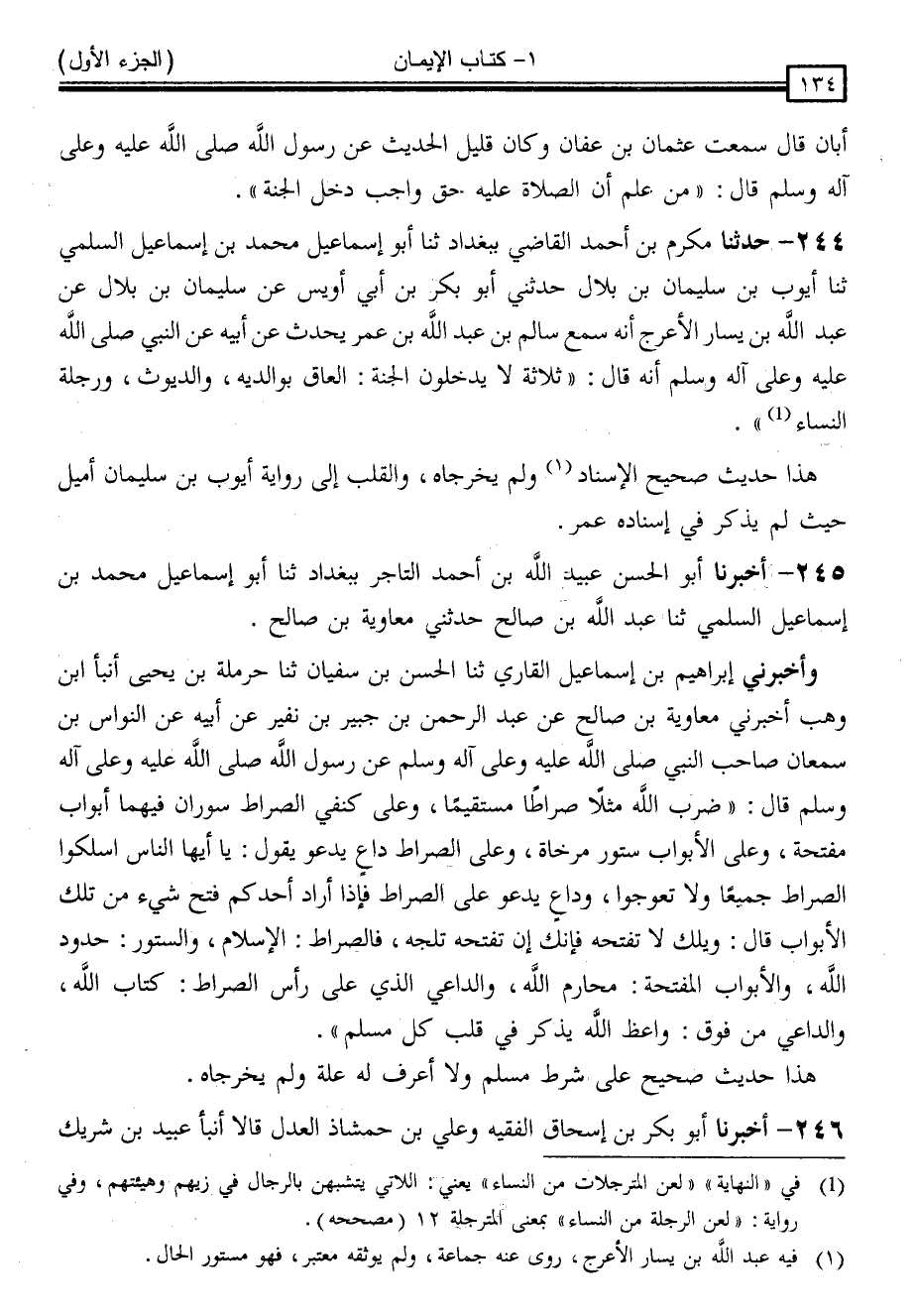 245 - أَخْبَرَنَا أَبُو الْحَسَنِ * عُبَيْدُ اللَّهِ بْنُ أَحْمَدَ التَّاجِرُ ، بِبَغْدَادَ ، ثنا أَبُو إِسْمَاعِيلَ مُحَمَّدُ بْنُ إِسْمَاعِيلَ السُّلَمِيُّ ، ثنا عَبْدُ اللَّهِ بْنُ صَالِحٍ ، حَدَّثَنِي مُعَاوِيَةُ بْنُ صَالِحٍ ، وَأَخْبَرَنِي إِبْرَاهِيمُ بْنُ إِسْمَاعِيلَ الْقَارِئُ ، ثنا الْحَسَنُ بْنُ سُفْيَانَ ، ثنا حَرْمَلَةُ بْنُ يَحْيَى ، أَنْبَأَ ابْنُ وَهْبٍ ، أَخْبَرَنِي مُعَاوِيَةُ بْنُ صَالِحٍ ، عَنْ عَبْدِ الرَّحْمَنِ بْنِ جُبَيْرِ بْنِ نُفَيْرٍ ، عَنْ أَبِيهِ ، عَنِ النَّوَّاسِ بْنِ سَمْعَانَ ، صَاحِبِ النَّبِيِّ صَلَّى اللَّهُ عَلَيْهِ وَسَلَّمَ ، عَنْ رَسُولِ اللَّهِ صَلَّى اللَّهُ عَلَيْهِ وَسَلَّمَ ، قَالَ: " ضَرَبَ اللَّهُ مَثَلًا صِرَاطًا مُسْتَقِيمًا عَلَى كَتِفَيَّ الصِّرَاطِ سُورَانِ فِيهِمَا أَبْوَابٌ مُفَتَّحَةٌ ، وَعَلَى الْأَبْوَابِ سُتُورٌ مُرْخَاةٌ ، وَعَلَى الصِّرَاطِ دَاعٍ يَدْعُو يَقُولُ: يَا أَيُّهَا النَّاسُ اسْلُكُوا الصِّرَاطَ جَمِيعًا وَلَا تَعْوَجُّوا ، وَدَاعٍ يَدْعُو عَلَى الصِّرَاطِ ، فَإِذَا أَرَادَ أَحَدُكُمْ فَتْحَ شَيْءٍ مِنْ تِلْكَ الْأَبْوَابِ ، قَالَ: وَيْلَكَ لَا تَفْتَحْهُ فَإِنَّكَ إِنْ تَفْتَحْهُ تَلِجْهُ ، فَالصِّرَاطُ: الْإِسْلَامُ ، وَالسُّتُورُ: حُدُودُ اللَّهِ ، وَالْأَبْوَابُ الْمُفَتَّحَةُ مَحَارِمُ اللَّهِ ، وَالدَّاعِي الَّذِي عَلَى رَأْسِ الصِّرَاطِ كِتَابُ اللَّهِ ، وَالدَّاعِي مِنْ فَوْقُ وَاعِظُ اللَّهِ يَذْكُرِ فِي قَلْبِ كُلِّ مُسْلِمٍ " .