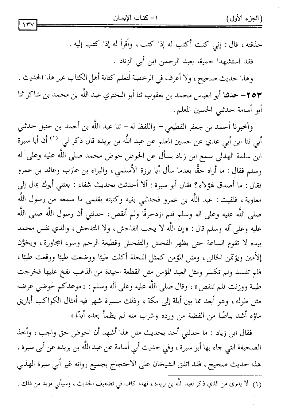 253 - حَدَّثَنَا أَبُو الْعَبَّاسِ مُحَمَّدُ بْنُ يَعْقُوبَ ، ثنا أَبُو الْبَخْتَرِيِّ عَبْدُ اللَّهِ بْنُ مُحَمَّدِ بْنِ شَاكِرٍ ، ثنا أَبُو أُسَامَةَ ، حَدَّثَنِي الْحُسَيْنُ الْمُعَلِّمُ ، وَأَخْبَرَنَا أَحْمَدُ بْنُ جَعْفَرٍ الْقَطِيعِيُّ - وَاللَّفْظُ لَهُ - ، ثنا عَبْدُ اللَّهِ بْنُ أَحْمَدَ بْنِ حَنْبَلٍ ، حَدَّثَنِي أَبِي ، ثنا ابْنُ أَبِي عَدِيٍّ ، عَنْ حُسَيْنٍ الْمُعَلِّمِ ، عَنْ عَبْدِ اللَّهِ بْنِ بُرَيْدَةَ ، قَالَ: ذُكِرَ لِي أَنَّ أَبَا سَبْرَةَ بْنَ سَلَمَةَ الْهُذَلِيَّ ، سَمِعَ ابْنَ زِيَادٍ ، يَسْأَلُ عَنِ الْحَوْضِ حَوْضِ مُحَمَّدٍ صَلَّى اللَّهُ عَلَيْهِ وَسَلَّمَ ، فَقَالَ: مَا أُرَاهُ حَقًّا بَعْدَمَا سَأَلَ أَبَا بَرْزَةَ الْأَسْلَمِيَّ وَالْبَرَاءَ بْنَ عَازِبٍ وَعَائِذَ بْنَ عَمْرٍو ، فَقَالَ: مَا أُصَدِّقُ هَؤُلَاءِ ، فَقَالَ أَبُو سَبْرَةَ: أَلَا أُحَدِّثُكَ بِحَدِيثٍ شِفَاءٍ ؟ بَعَثَنِي أَبُوكَ بِمَالٍ إِلَى مُعَاوِيَةَ فَلَقِيتُ عَبْدَ اللَّهِ بْنَ عَمْرٍو فَحَدَّثَنِي بِفِيهِ وَكَتَبْتُهُ بِقَلَمِي مَا سَمِعَهُ مِنْ رَسُولِ اللَّهِ صَلَّى اللَّهُ عَلَيْهِ وَسَلَّمَ فَلَمْ أَزِدْ حَرْفًا وَلَمْ أَنْقُصْ ، حَدَّثَنِي أَنَّ رَسُولَ اللَّهِ صَلَّى اللَّهُ عَلَيْهِ وَسَلَّمَ ، قَالَ: " إِنَّ اللَّهَ لَا يُحِبُّ الْفَاحِشَ وَلَا الْمُتَفَحِّشَ ، وَالَّذِي نَفْسُ مُحَمَّدٍ بِيَدِهِ لَا تَقُومُ السَّاعَةُ حَتَّى يَظْهَرَ الْفُحْشُ وَالتَّفَحُّشُ وَقَطِيعَةُ الرَّحِمِ وَسُوءُ الْمُجَاوَرَةِ ، وَيُخَوَّنُ الْأَمِينُ وَيُؤْتَمَنُ الْخَائِنُ ، وَمَثَلُ الْمُؤْمِنِ كَمَثَلِ النَّحْلَةِ أَكَلَتْ طَيِّبًا وَوَضَعَتْ طَيِّبًا وَوَقَعَتْ طَيِّبًا ، فَلَمْ تَفْسُدْ وَلَمْ تُكْسَرْ ، وَمَثَلُ الْعَبْدِ الْمُؤْمِنِ مَثَلُ الْقِطْعَةِ الْجَيِّدَةِ مِنَ الذَّهَبِ نُفِخَ عَلَيْهَا فَخَرَجَتْ طَيِّبَةً وَوُزِنَتْ فَلَمْ تَنْقُصْ " وَقَالَ صَلَّى اللَّهُ عَلَيْهِ وَسَلَّمَ: " مَوْعِدُكُمْ حَوْضِي عَرْضُهُ مِثْلُ طُولِهِ ، وَهُوَ أَبْعَدُ مِمَّا بَيْنَ أَيْلَةَ إِلَى مَكَّةَ ، وَذَلِكَ مَسِيرَةُ شَهْرٍ ، فِيهِ أَمْثَالُ الْكَوَاكِبِ أَبَارِيقُ ، مَاؤُهُ أَشَدُّ بَيَاضًا مِنَ الْفِضَّةِ مَنْ وَرَدَهُ ، وَشَرِبَ مِنْهُ لَمْ يَظْمَأْ بَعْدَهُ أَبَدًا " . فَقَالَ ابْنُ زِيَادٍ: مَا حَدَّثَنِي أَحَدٌ بِحَدِيثٍ مِثْلِ هَذَا ، أَشْهَدُ أَنَّ الْحَوْضَ حَقٌّ وَاجِبٌ ، وَأَخَذَ الصَّحِيفَةَ الَّتِي جَاءَ بِهَا أَبُو سَبْرَةَ . وَفِي حَدِيثِ أَبِي أُسَامَةَ ، عَنْ عَبْدِ اللَّهِ بْنِ بُرَيْدَةَ ، عَنْ أَبِي سَبْرَةَ .