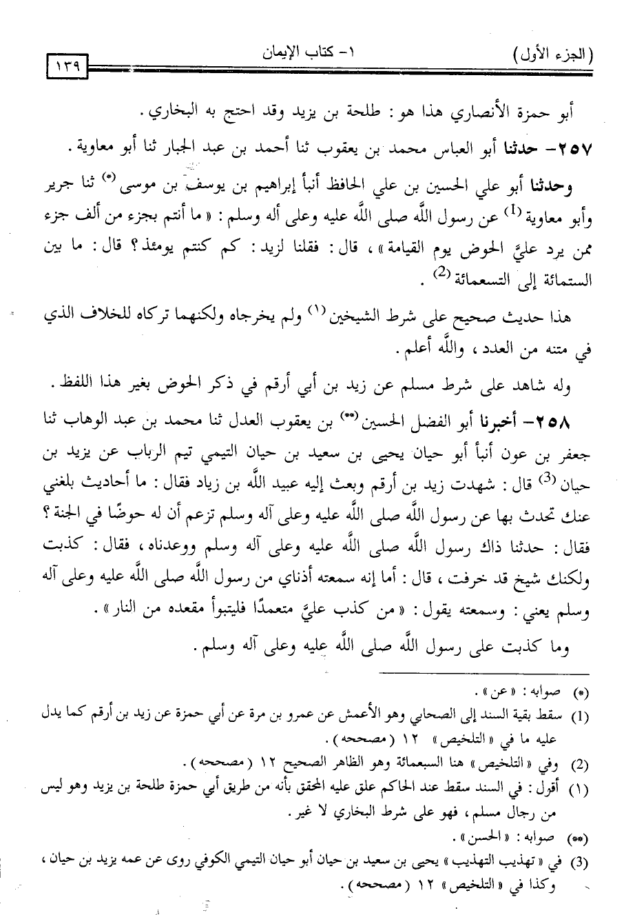 258 - أَخْبَرَنَا أَبُو الْفَضْلِ الْحَسَنُ بْنُ يَعْقُوبَ الْعَدْلُ ، ثنا مُحَمَّدُ بْنُ عَبْدِ الْوَهَّابِ ، ثنا جَعْفَرُ بْنُ عَوْنٍ ، أَنْبَأَ أَبُو حَيَّانَ يَحْيَى بْنُ سَعِيدِ بْنِ حَيَّانَ التَّيْمِيُّ تَيْمُ الرَّبَابِ ، عَنْ يَزِيدَ بْنِ حَيَّانَ ، قَالَ: شَهِدْتُ زَيْدَ بْنَ أَرْقَمَ وَبَعَثَ إِلَيْهِ عُبَيْدُ اللَّهِ بْنُ زِيَادٍ ، فَقَالَ: مَا أَحَادِيثُ بَلَغَنِي عَنْكَ تُحَدِّثُ بِهَا عَنْ رَسُولِ اللَّهِ صَلَّى اللَّهُ عَلَيْهِ وَسَلَّمَ تَزْعُمُ أَنَّ لَهُ حَوْضًا فِي الْجَنَّةِ ، فَقَالَ: حَدَّثَنَا ذَاكَ رَسُولُ اللَّهِ صَلَّى اللَّهُ عَلَيْهِ وَسَلَّمَ وَوَعَدْنَاهُ ، فَقَالَ: كَذَبْتَ ، وَلَكِنَّكَ شَيْخٌ قَدْ خَرِفْتَ ، قَالَ: أَمَا إِنَّهُ سَمِعَتْهُ أُذُنَايَ مِنْ رَسُولِ اللَّهِ صَلَّى اللَّهُ عَلَيْهِ وَسَلَّمَ يَعْنِي وَسَمِعْتُهُ ، يَقُولُ: " مَنْ كَذَبَ عَلَيَّ مُتَعَمِّدًا فَلْيَتَبَوَّأْ مَقْعَدَهُ مِنَ النَّارِ " . وَمَا كَذَبْتُ عَلَى رَسُولِ اللَّهِ صَلَّى اللَّهُ عَلَيْهِ وَسَلَّمَ