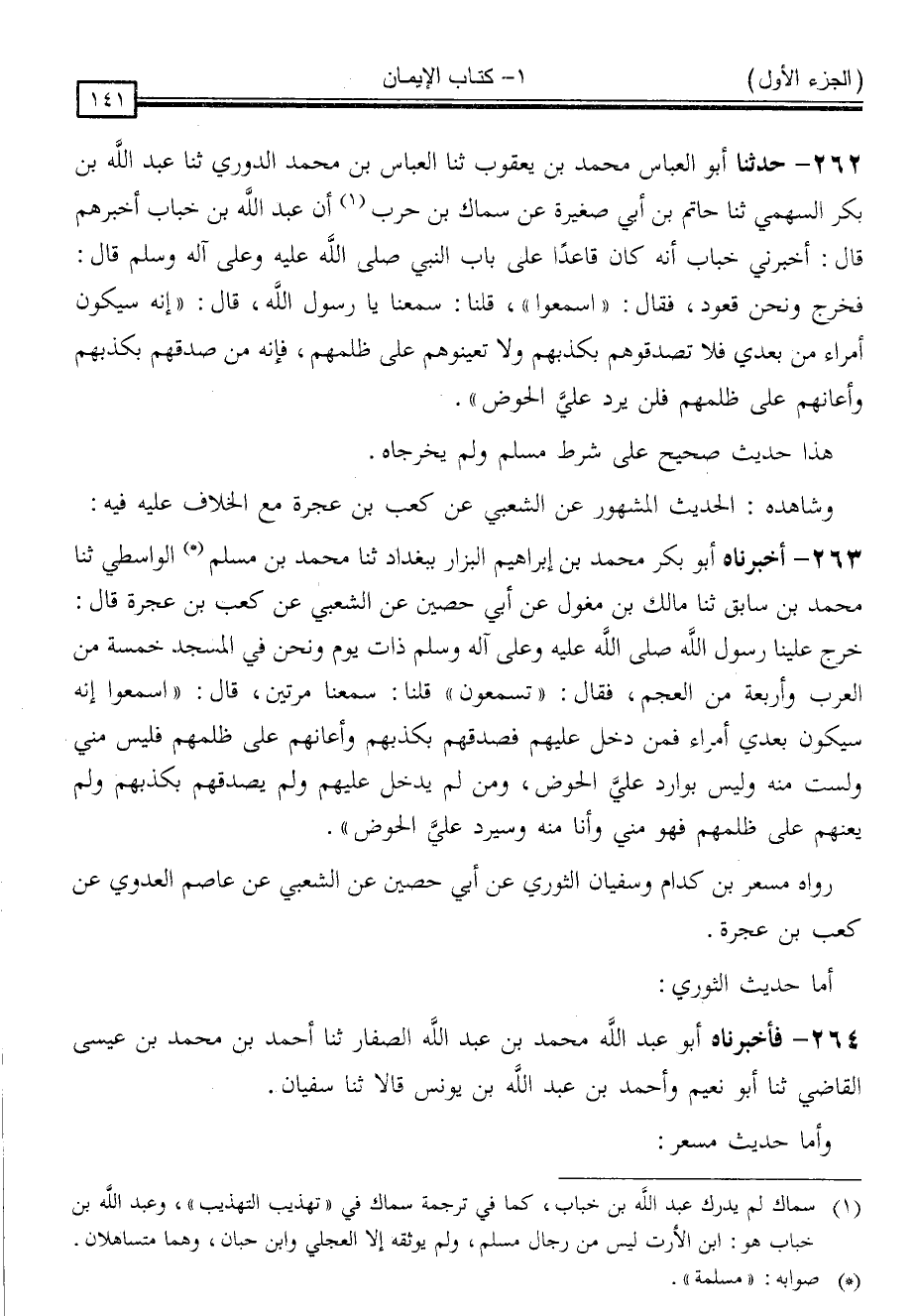 263 - أَخْبَرْنَاهُ أَبُو بَكْرٍ مُحَمَّدُ بْنُ [عَبْدِ اللَّهِ بْنِ] إِبْرَاهِيمَ الْبَزَّارُ ، بِبَغْدَادَ ، ثنا مُحَمَّدُ بْنُ مُسْلِمٍ * الْوَاسِطِيُّ ، ثنا مُحَمَّدُ بْنُ سَابِقٍ ، ثنا مَالِكُ بْنُ مِغْوَلٍ ، عَنْ أَبِي حَصِينٍ ، عَنِ الشَّعْبِيِّ ، عَنْ كَعْبِ بْنِ عُجْرَةَ ، قَالَ: خَرَجَ عَلَيْنَا رَسُولُ اللَّهِ صَلَّى اللَّهُ عَلَيْهِ وَسَلَّمَ ذَاتَ يَوْمٍ وَنَحْنُ فِي الْمَسْجِدِ خَمْسَةٌ مِنَ الْعَرَبِ وَأَرْبَعَةٌ مِنَ الْعَجَمِ ، فَقَالَ: " أَتَسْمَعُونَ ؟ " قُلْنَا: سَمِعْنَا ، مَرَّتَيْنِ ، قَالَ: " اسْمَعُوا ، إِنَّهُ سَيَكُونُ بَعْدِي أُمَرَاءُ فَمَنْ دَخَلَ عَلَيْهِمْ فَصَدَّقَهُمْ بِكَذِبِهِمْ وَأَعَانَهُمْ عَلَى ظُلْمِهِمْ فَلَيْسَ مِنِّي وَلَسْتُ مِنْهُ وَلَيْسَ بِوَارِدٍ عَلَيَّ الْحَوْضَ ، وَمَنْ لَمْ يَدْخُلْ عَلَيْهِمْ وَلَمْ يُصَدِّقْهُمْ بِكَذِبِهِمْ وَلَمْ يُعِنْهُمْ عَلَى ظُلْمِهِمْ فَهُوَ مِنِّي وَأَنَا مِنْهُ وَسَيَرِدُ عَلَيَّ الْحَوْضَ " . رَوَاهُ مِسْعَرُ بْنُ كِدَامٍ ، وَسُفْيَانُ الثَّوْرِيُّ ، عَنْ أَبِي حَصِينٍ ، عَنِ الشَّعْبِيِّ ، عَنْ عَاصِمٍ الْعَدَوِيِّ ، عَنْ كَعْبِ بْنِ عُجْرَةَ .