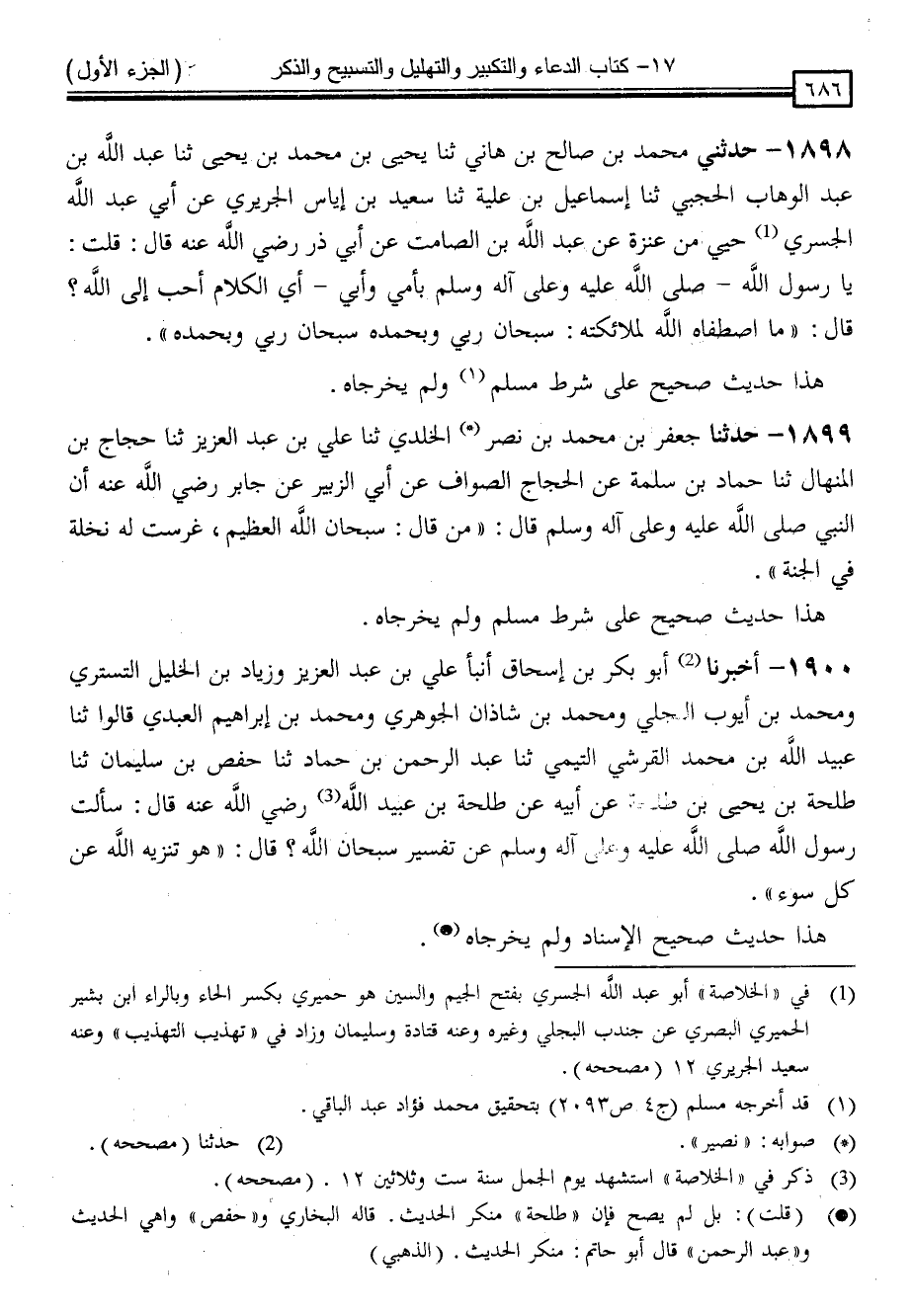 1898 - حَدَّثَنِي مُحَمَّدُ بْنُ صَالِحِ بْنِ هَانِئٍ ، ثنا يَحْيَى بْنُ مُحَمَّدِ بْنِ يَحْيَى ، ثنا عَبْدُ اللَّهِ بْنُ عَبْدِ الْوَهَّابِ الْحَجَبِيُّ ، ثنا إِسْمَاعِيلُ بْنُ عُلَيَّةَ ، ثنا سَعِيدُ بْنُ إِيَاسٍ الْجُرَيْرِيُّ ، عَنْ أَبِي عَبْدِ اللَّهِ الْجَسْرِيُّ ، حَيٌّ مِنْ عَنَزَةَ ، عَنْ عَبْدِ اللَّهِ بْنِ الصَّامِتِ ، عَنْ أَبِي ذَرٍّ رَضِيَ اللَّهُ عَنْهُ ، قَالَ: قُلْتُ: يَا رَسُولَ اللَّهِ صَلَّى اللَّهُ عَلَيْهِ وَسَلَّمَ بِأُمِّي وَأَبِي أَيُّ الْكَلَامِ أَحَبُّ إِلَى اللَّهِ ؟ قَالَ: " مَا اصْطَفَاهُ اللَّهُ لِمَلَائِكَتِهِ: سُبْحَانَ رَبِّي وَبِحَمْدِهِ ، سُبْحَانَ رَبِّي وَبِحَمْدِهِ "