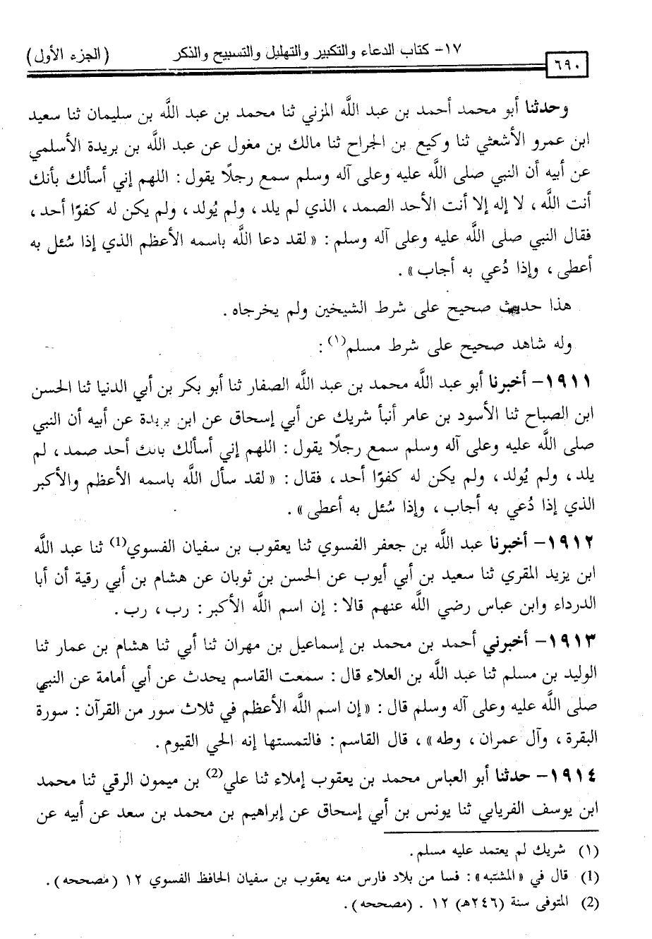 1911 - أَخْبَرَنَا أَبُو عَبْدِ اللَّهِ مُحَمَّدُ بْنُ عَبْدِ اللَّهِ الصَّفَّارُ ، ثنا أَبُو بَكْرِ بْنُ أَبِي الدُّنْيَا ، ثنا الْحَسَنُ بْنُ الصَّبَّاحِ ، ثنا الْأَسْوَدُ بْنُ عَامِرٍ ، أَنْبَأَ شَرِيكٌ ، عَنْ أَبِي إِسْحَاقَ ، عَنِ ابْنِ بُرَيْدَةَ ، عَنْ أَبِيهِ ، أَنَّ النَّبِيَّ صَلَّى اللَّهُ عَلَيْهِ وَسَلَّمَ سَمِعَ رَجُلًا يَقُولُ: اللَّهُمَّ إِنِّي أَسْأَلُكَ بِأَنَّكَ أَحَدٌ صَمَدٌ ، لَمْ يَلِدْ ، وَلَمْ يُولَدْ ، وَلَمْ يَكُنْ لَهُ كُفُوًا أَحَدٌ ، فَقَالَ: " لَقَدْ سَأَلَ اللَّهَ بِاسْمِهِ الْأَعْظَمِ وَالْأَكْبَرِ ، الَّذِي إِذَا دُعِيَ بِهِ أَجَابَ ، وَإِذَا سُئِلَ بِهِ أَعْطَى "