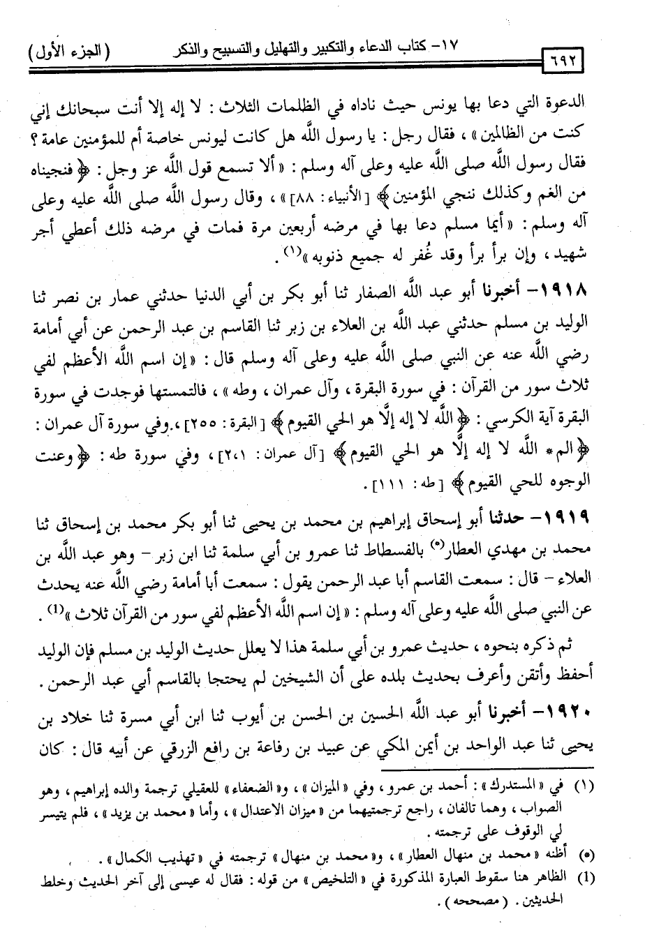 1918 - أَخْبَرَنَا أَبُو عَبْدِ اللَّهِ الصَّفَّارُ ، ثنا أَبُو بَكْرِ بْنُ أَبِي الدُّنْيَا ، حَدَّثَنِي عَمَّارُ بْنُ نَصْرٍ ، ثنا الْوَلِيدُ بْنُ مُسْلِمٍ ، حَدَّثَنِي عَبْدُ اللَّهِ بْنُ الْعَلَاءِ بْنِ زَبْرٍ ، ثنا الْقَاسِمُ بْنُ عَبْدِ الرَّحْمَنِ ، عَنْ أَبِي أُمَامَةَ رَضِيَ اللَّهُ عَنْهُ ، عَنِ النَّبِيِّ صَلَّى اللَّهُ عَلَيْهِ وَسَلَّمَ ، قَالَ: " إِنَّ اسْمَ اللَّهِ الْأَعْظَمَ لَفِي ثَلَاثِ سُوَرٍ مِنَ الْقُرْآنِ: فِي سُورَةِ الْبَقَرَةِ ، وَآلِ عِمْرَانَ ، وَطَهَ " فَالْتَمَسْتُهَا فَوَجَدْتُ فِي سُورَةِ الْبَقَرَةِ آيَةَ الْكُرْسِيِّ: { اللَّهُ لَا إِلَهَ إِلَّا هُوَ الْحَيُّ الْقَيُّومُ } [البقرة: 255] ، وَفِي سُورَةِ آلِ عِمْرَانَ: { الم اللَّهُ لَا إِلَهَ إِلَّا هُوَ الْحَيُّ الْقَيُّومُ } [آل عمران: 2] ، وَفِي سُورَةِ طَهَ: { وَعَنَتِ الْوُجُوهُ لِلْحَيِّ الْقَيُّومِ } [طه: 111]
