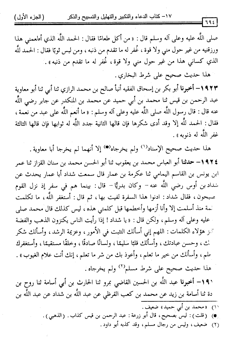 1923 - أَخْبَرَنَا أَبُو بَكْرِ بْنُ إِسْحَاقَ الْفَقِيهُ ، أَنْبَأَ صَالِحُ بْنُ مُحَمَّدٍ الرَّازِيُّ ، ثنا أَبِي ، ثنا أَبُو مُعَاوِيَةَ عَبْدُ الرَّحْمَنِ بْنُ قَيْسٍ ، ثنا مُحَمَّدُ بْنُ أَبِي حُمَيْدٍ ، عَنْ مُحَمَّدِ بْنِ الْمُنْكَدِرِ ، عَنْ جَابِرٍ رَضِيَ اللَّهُ عَنْهُ ، قَالَ: قَالَ رَسُولُ اللَّهِ صَلَّى اللَّهُ عَلَيْهِ وَسَلَّمَ: " مَا أَنْعَمَ اللَّهُ عَلَى عَبْدٍ مِنْ نِعْمَةٍ فَقَالَ: الْحَمْدُ لِلَّهِ إِلَّا وَقَدْ أَدَّى شُكْرَهَا ، فَإِنْ قَالَهَا الثَّانِيَةَ جَدَّدَ اللَّهُ لَهُ ثَوَابَهَا ، فَإِنْ قَالَهَا الثَّالِثَةَ غَفَرَ اللَّهُ لَهُ ذُنُوبَهُ "