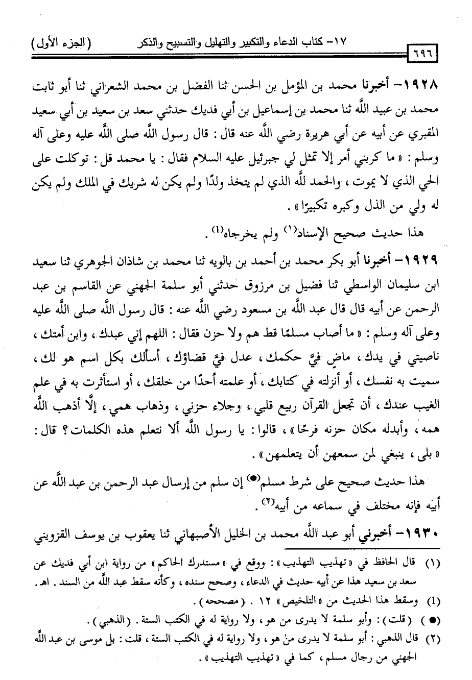 1929 - أَخْبَرَنَا أَبُو بَكْرٍ مُحَمَّدُ بْنُ أَحْمَدَ بْنِ بَالَوَيْهِ ، ثنا مُحَمَّدُ بْنُ شَاذَانَ الْجَوْهَرِيُّ ، ثنا سَعِيدُ بْنُ سُلَيْمَانَ الْوَاسِطِيُّ ، ثنا فُضَيْلُ بْنُ مَرْزُوقٍ ، حَدَّثَنِي أَبُو سَلَمَةَ الْجُهَنِيُّ ، عَنِ الْقَاسِمِ بْنِ عَبْدِ الرَّحْمَنِ ، عَنْ أَبِيهِ ، قَالَ: قَالَ عَبْدُ اللَّهِ بْنُ مَسْعُودٍ رَضِيَ اللَّهُ عَنْهُ ، قَالَ رَسُولُ اللَّهِ صَلَّى اللَّهُ عَلَيْهِ وَسَلَّمَ: " مَا أَصَابَ مُسْلِمًا قَطُّ هَمٌّ وَلَا حَزَنٌ فَقَالَ: اللَّهُمَّ إِنِّي عَبْدُكَ وَابْنُ أَمَتِكَ ، نَاصِيَتِي فِي يَدِكَ مَاضٍ فِيَّ حُكْمُكَ ، عَدْلٌ فِي قَضَاؤُكَ ، أَسْأَلُكَ بِكُلِّ اسْمٍ هُوَ لَكَ سَمَّيْتَ بِهِ نَفْسَكَ ، أَوْ أَنْزَلْتَهُ فِي كِتَابِكَ ، أَوْ عَلَّمْتَهُ أَحَدًا مِنْ خَلْقِكَ ، أَوِ اسْتَأْثَرْتَ بِهِ فِي عِلْمِ الْغَيْبِ عِنْدَكَ ، أَنْ تَجْعَلَ الْقُرْآنَ رَبِيعَ قَلْبِي ، وَجِلَاءَ حُزْنِي ، وَذَهَابَ هَمِّي ، إِلَّا أَذْهَبَ اللَّهُ هَمَّهُ ، وَأَبْدَلَهُ مَكَانَ حُزْنِهِ فَرَحًا " قَالُوا: يَا رَسُولَ اللَّهِ أَلَا نَتَعَلَّمُ هَذِهِ الْكَلِمَاتِ ؟ قَالَ: " بَلَى يَنْبَغِي لِمَنْ سَمِعَهُنَّ أَنْ يَتَعَلَّمَهُنَّ "