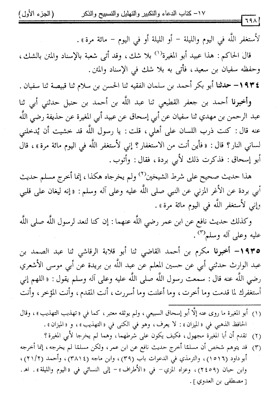 1934 - حَدَّثَنَا أَبُو بَكْرٍ أَحْمَدُ بْنُ سَلْمَانَ الْفَقِيهُ ، ثنا الْحَسَنُ بْنُ سَلَّامٍ ، ثنا قَبِيصَةُ ، ثنا سُفْيَانُ ، وَأَخْبَرَنَا أَحْمَدُ بْنُ جَعْفَرٍ الْقَطِيعِيُّ ، ثنا عَبْدُ اللَّهِ بْنُ أَحْمَدَ بْنِ حَنْبَلٍ ، حَدَّثَنِي أَبِي ، ثنا عَبْدُ الرَّحْمَنِ بْنُ مَهْدِيٍّ ، ثنا سُفْيَانُ ، عَنْ أَبِي إِسْحَاقَ ، عَنْ عُبَيْدٍ أَبِي الْمُغِيرَةِ ، عَنْ حُذَيْفَةَ رَضِيَ اللَّهُ عَنْهُ ، قَالَ: كُنْتُ ذَرِبَ اللِّسَانِ عَلَى أَهْلِي قُلْتُ يَا رَسُولَ اللَّهِ ، قَدْ خَشِيتُ أَنْ يُدْخِلَنِي لِسَانِي النَّارَ ، قَالَ: " فَأَيْنَ أَنْتَ مِنَ الِاسْتِغْفَارِ ؟ إِنِّي لَأَسْتَغْفِرُ اللَّهَ فِي الْيَوْمِ مِائَةَ مَرَّةٍ " قَالَ أَبُو إِسْحَاقَ: فَذَكَرْتُ ذَلِكَ لِأَبِي بُرْدَةَ ، فَقَالَ: " وَأَتُوبُ "