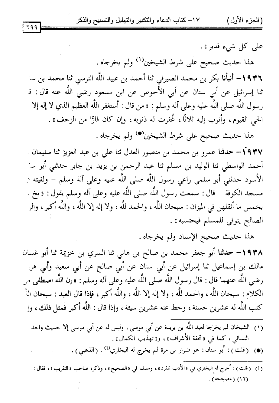 1936 - أَنْبَأَنَا بَكْرُ بْنُ مُحَمَّدٍ الصَّيْرَفِيُّ ، ثنا أَحْمَدُ بْنُ عُبَيْدِ اللَّهِ النَّرْسِيُّ ، ثنا مُحَمَّدُ بْنُ سَابِقٍ ، ثنا إِسْرَائِيلُ ، عَنْ أَبِي سِنَانٍ ، عَنْ أَبِي الْأَحْوَصِ ، عَنِ ابْنِ مَسْعُودٍ رَضِيَ اللَّهُ عَنْهُ ، قَالَ: قَالَ رَسُولُ اللَّهِ صَلَّى اللَّهُ عَلَيْهِ وَسَلَّمَ: " مَنْ قَالَ: أَسْتَغْفِرُ اللَّهَ الْعَظِيمَ الَّذِي لَا إِلَهَ إِلَّا هُوَ الْحَيُّ الْقَيُّومُ ، وَأَتُوبُ إِلَيْهِ ثَلَاثًا ، غُفِرَتْ لَهُ ذُنُوبُهُ ، وَإِنْ كَانَ فَارًّا مِنَ الزَّحْفِ "