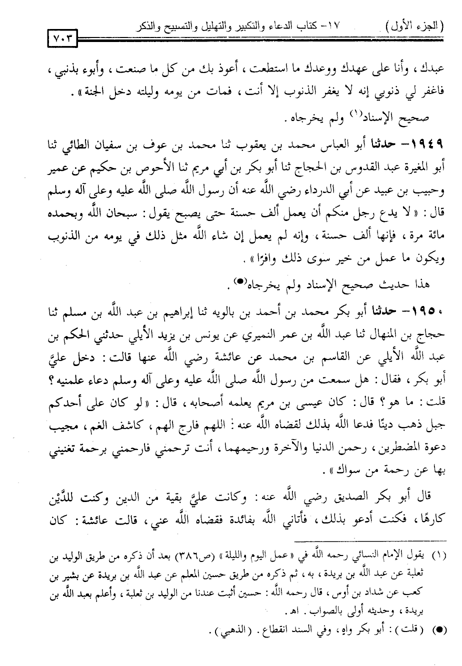 1949 - حَدَّثَنَا أَبُو الْعَبَّاسِ مُحَمَّدُ بْنُ يَعْقُوبَ ، ثنا مُحَمَّدُ بْنُ عَوْفِ بْنِ سُفْيَانَ الطَّائِيُّ ، ثنا أَبُو الْمُغِيرَةِ عَبْدُ الْقُدُّوسِ بْنُ الْحَجَّاجِ ، ثنا أَبُو بَكْرِ بْنُ أَبِي مَرْيَمَ ، ثنا الْأَحْوَصُ بْنُ حَكِيمٍ بْنِ عُمَيْرٍ ، وَحَبِيبِ بْنِ عُبَيْدٍ ، عَنْ أَبِي الدَّرْدَاءِ رَضِيَ اللَّهُ عَنْهُ ، أَنَّ رَسُولَ اللَّهِ صَلَّى اللَّهُ عَلَيْهِ وَسَلَّمَ قَالَ: " لَا يَدَعُ رَجُلٌ مِنْكُمْ أَنْ يَعْمَلَ أَلْفَ حَسَنَةٍ حَتَّى يُصْبِحَ يَقُولُ: سُبْحَانَ اللَّهِ وَبِحَمْدِهِ مِائَةَ مَرَّةٍ ، فَإِنَّهَا أَلْفُ حَسَنَةٍ ، وَأَنَّهُ لَمْ يَعْمَلْ إِنْ شَاءَ اللَّهُ مِثْلَ ذَلِكَ فِي يَوْمِهِ مِنَ الذُّنُوبِ ، وَيَكُونُ مَا عَمِلَ مِنْ خَيْرٍ سِوَى ذَلِكَ وَافِرًا "