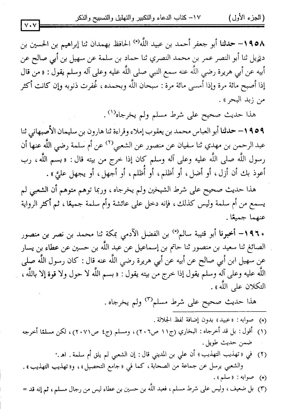 1958 - حَدَّثَنَا أَبُو جَعْفَرٍ أَحْمَدُ بْنُ عُبَيْدٍ الْحَافِظُ بِهَمْدَانَ ، ثنا إِبْرَاهِيمُ بْنُ الْحُسَيْنِ بْنِ دِيزِيلَ ، ثنا أَبُو النَّصْرِ عُمَرُ بْنُ مُحَمَّدٍ النَّصْرِيُّ ، ثنا حَمَّادُ بْنُ سَلَمَةَ ، عَنْ سُهَيْلِ بْنِ أَبِي صَالِحٍ ، عَنْ أَبِيهِ ، عَنْ أَبِي هُرَيْرَةَ رَضِيَ اللَّهُ عَنْهُ سَمِعَ النَّبِيَّ صَلَّى اللَّهُ عَلَيْهِ وَسَلَّمَ يَقُولُ: " مَنْ قَالَ إِذَا أَصْبَحَ مِائَةَ مَرَّةٍ ، وَإِذَا أَمْسَى مِائَةَ مَرَّةٍ: سُبْحَانَ اللَّهِ وَبِحَمْدِهِ غُفِرَتْ ذُنُوبُهُ ، وَإِنْ كَانَتْ أَكْثَرَ مِنْ زَبَدِ الْبَحْرِ "