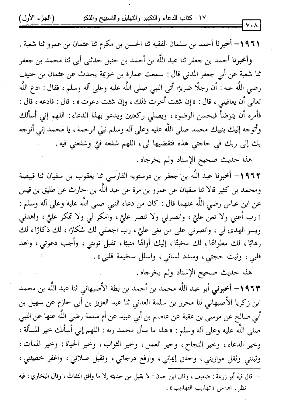 1961 - أَخْبَرَنَا أَحْمَدُ بْنُ سَلْمَانَ الْفَقِيهُ ، ثنا الْحَسَنُ بْنُ مُكْرَمٍ ، ثنا عُثْمَانُ بْنُ عَمْرٍو ، ثنا شُعْبَةُ ، وَأَخْبَرَنَا أَحْمَدُ بْنُ جَعْفَرٍ ، ثنا عَبْدُ اللَّهِ بْنُ أَحْمَدَ بْنِ حَنْبَلٍ ، حَدَّثَنِي أَبِي ، ثنا مُحَمَّدُ بْنُ جَعْفَرٍ ، ثنا شُعْبَةُ ، عَنْ أَبِي جَعْفَرٍ الْمَدَنِيِّ ، قَالَ: سَمِعْتُ عُمَارَةَ بْنَ خُزَيْمَةَ ، يُحَدِّثُ ، عَنْ عُثْمَانَ بْنِ حُنَيْفٍ رَضِيَ اللَّهُ عَنْهُ ، أَنَّ رَجُلًا ضَرِيرًا أَتَى النَّبِيَّ صَلَّى اللَّهُ عَلَيْهِ وَسَلَّمَ ، فَقَالَ: ادْعُ اللَّهَ تَعَالَى أَنْ يُعَافِيَنِي ، قَالَ: " إِنْ شِئْتَ أَخَّرْتُ ذَلِكَ ، وَإِنْ شِئْتَ دَعَوْتُ " قَالَ: فَادْعُهُ . قَالَ: " فَأَمَرَهُ أَنْ يَتَوَضَّأَ ، فَيُحْسِنَ الْوُضُوءَ ، وَيُصَلِّيَ رَكْعَتَيْنِ ، وَيَدْعُو بِهَذَا الدُّعَاءِ: اللَّهُمَّ أَسْأَلُكَ ، وَأَتَوَجَّهُ إِلَيْكَ بِنَبِيِّكَ مُحَمَّدٍ صَلَّى اللَّهُ عَلَيْهِ وَسَلَّمَ نَبِيِّ الرَّحْمَةِ ، يَا مُحَمَّدُ إِنِّي أَتَوَجَّهُ بِكَ إِلَى رَبِّكَ فِي حَاجَتِي هَذِهِ فَتَقْضِيهَا لِي ، اللَّهُمَّ شَفِّعْهُ فِيَّ وَشَفِّعْنِي فِيهِ "