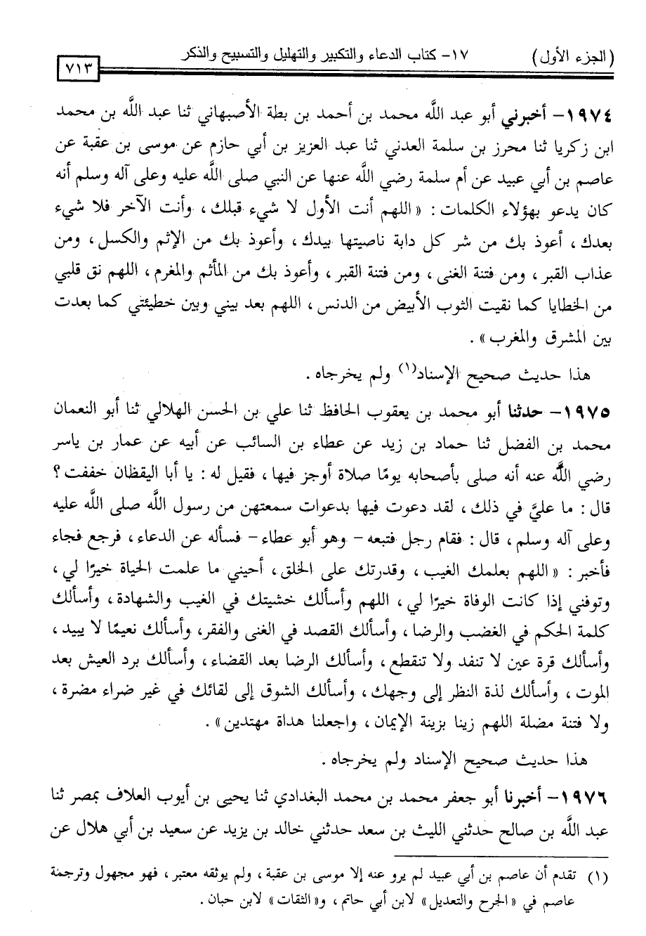 1974 - أَخْبَرَنِي أَبُو عَبْدِ اللَّهِ مُحَمَّدُ بْنُ أَحْمَدَ بْنِ بُطَّةَ الْأَصْبَهَانِيُّ ، ثنا عَبْدُ اللَّهِ بْنُ مُحَمَّدِ بْنِ زَكَرِيَّا ، ثنا مُحْرِزُ بْنُ سَلَمَةَ الْعَدَنِيُّ ، ثنا عَبْدُ الْعَزِيزِ بْنُ أَبِي حَازِمٍ ، عَنْ مُوسَى بْنِ عُقْبَةَ ، عَنْ عَاصِمِ بْنِ أَبِي عُبَيْدٍ ، عَنْ أُمِّ سَلَمَةَ رَضِيَ اللَّهُ عَنْهَا ، عَنِ النَّبِيِّ صَلَّى اللَّهُ عَلَيْهِ وَسَلَّمَ أَنَّهُ كَانَ يَدْعُو بِهَؤُلَاءِ الْكَلِمَاتِ: " اللَّهُمَّ أَنْتَ الْأَوَّلُ لَا شَيْءَ قَبْلَكَ ، وَأَنْتَ الْآخِرُ فَلَا شَيْءَ بَعْدَكَ ، أَعُوذُ بِكَ مِنْ شَرِّ كُلِّ دَابَّةٍ نَاصِيَتُهَا بِيَدِكَ ، وَأَعُوذُ بِكَ مِنَ الْإِثْمِ وَالْكَسَلِ ، وَمِنْ عَذَابِ الْقَبْرِ ، وَمِنْ فِتْنَةِ الْغِنَى ، وَمِنْ فِتْنَةِ الْقَبْرِ ، وَأَعُوذُ بِكَ مِنَ الْمَأْثَمِ وَالْمَغْرَمِ ، اللَّهُمَّ نَقِّ قَلْبِي مِنَ الْخَطَايَا كَمَا نَقَّيْتَ الثَّوْبَ الْأَبْيَضَ مِنَ الدَّنَسِ ، اللَّهُمَّ بَعِّدْ بَيْنِي ، وَبَيْنَ خَطِيئَتِي كَمَا بَعَّدْتَ بَيْنَ الْمَشْرِقِ وَالْمَغْرِبِ "