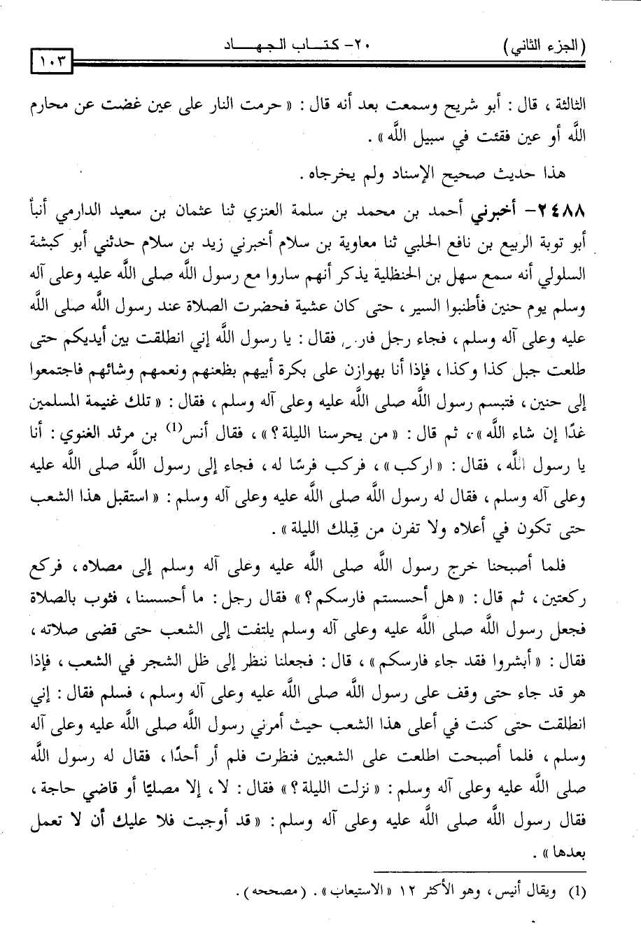 2488 - أَخْبَرَنِي أَحْمَدُ بْنُ مُحَمَّدِ بْنِ سَلَمَةَ الْعَنَزِيُّ ، ثنا عُثْمَانُ بْنُ سَعِيدٍ الدَّارِمِيُّ ، أَنْبَأَ أَبُو تَوْبَةَ الرَّبِيعُ بْنُ نَافِعٍ الْحَلَبِيُّ ، ثنا مُعَاوِيَةُ بْنُ سَلَّامٍ ، أَخْبَرَنِي زَيْدُ بْنُ سَلَّامٍ ، حَدَّثَنِي أَبُو كَبْشَةَ السَّلُولِيُّ ، أَنَّهُ سَمِعَ سَهْلَ بْنَ الْحَنْظَلِيَّةِ ، يَذْكُرُ أَنَّهُمْ سَارُوا مَعَ رَسُولِ اللَّهِ صَلَّى اللَّهُ عَلَيْهِ وَسَلَّمَ يَوْمَ حُنَيْنِ فَأَطْنَبُوا السَّيْرَ حَتَّى كَانَ عَشِيَّةً ، فَحَضَرَتِ الصَّلَاةُ عِنْدَ رَسُولِ اللَّهِ صَلَّى اللَّهُ عَلَيْهِ وَسَلَّمَ ، فَجَاءَ رَجُلٌ فَارِسٌ فَقَالَ: يَا رَسُولَ اللَّهِ ، إِنِّي انْطَلَقْتُ بَيْنَ أَيْدِيكُمْ حَتَّى طَلَعْتُ جَبَلَ كَذَا وَكَذَا ، فَإِذَا أَنَا بِهَوَازِنَ عَلَى بَكْرَةِ أَبِيهِمْ ، بِظُعُنِهِمْ ، وَنَعَمِهِمْ ، وَشَائِهِمْ ، فَاجْتَمَعُوا إِلَى حُنَيْنٍ فَتَبَسَّمَ رَسُولُ اللَّهِ صَلَّى اللَّهُ عَلَيْهِ وَسَلَّمَ فَقَالَ: " تِلْكَ غَنِيمَةُ الْمُسْلِمِينَ غَدًا إِنْ شَاءَ اللَّهُ ثُمَّ قَالَ: " مَنْ يَحْرُسُنَا اللَّيْلَةَ ؟ " فَقَالَ أَنَسُ بْنُ مَرْثَدٍ الْغَنَوِيُّ: أَنَا يَا رَسُولَ اللَّهِ فَقَالَ: " ارْكَبْ " ، فَرَكِبَ فَرَسًا لَهُ ، فَجَاءَ إِلَى رَسُولِ اللَّهِ صَلَّى اللَّهُ عَلَيْهِ وَسَلَّمَ فَقَالَ لَهُ رَسُولُ اللَّهِ صَلَّى اللَّهُ عَلَيْهِ وَسَلَّمَ: " اسْتَقْبِلْ هَذَا الشِّعْبَ حَتَّى تَكُونَ فِي أَعْلَاهُ ، وَلَا تَفِرَّنَّ مِنْ قِبَلِكَ اللَّيْلَةَ "