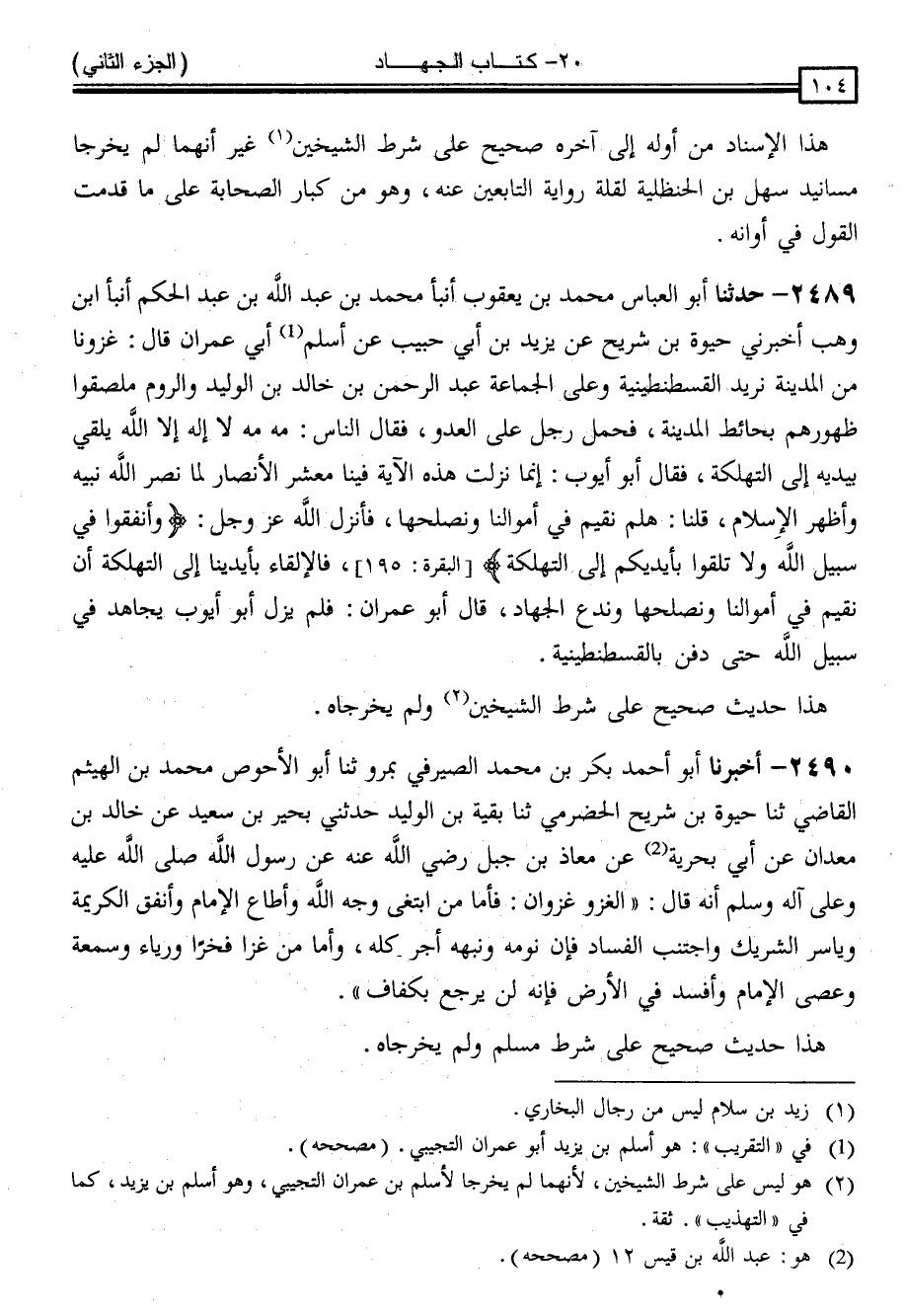 2489 - حَدَّثَنَا أَبُو الْعَبَّاسِ مُحَمَّدُ بْنُ يَعْقُوبَ ، أَنْبَأَ مُحَمَّدُ بْنُ عَبْدِ اللَّهِ بْنِ عَبْدِ الْحَكَمِ ، أَنْبَأَ ابْنُ وَهْبٍ ، أَخْبَرَنِي حَيْوَةُ بْنُ شُرَيْحٍ ، عَنْ يَزِيدَ بْنِ أَبِي حَبِيبٍ ، عَنْ أَسْلَمَ أَبِي عِمْرَانَ ، قَالَ: غَزَوْنَا مِنَ الْمَدِينَةِ نُرِيدُ الْقُسْطَنْطِينِيَّةَ وَعَلَى الْجَمَاعَةِ عَبْدُ الرَّحْمَنِ بْنُ خَالِدِ بْنِ الْوَلِيدِ وَالرُّومُ مُلْصِقُوا ظُهُورِهِمْ بِحَائِطِ الْمَدِينَةِ ، فَحَمَلَ رَجُلٌ عَلَى الْعَدُوِّ ، فَقَالَ النَّاسُ: مَهْ مَهْ لَا إِلَهَ إِلَّا اللَّهُ يُلْقِي بِيَدَيْهِ إِلَى التَّهْلُكَةَ . فَقَالَ أَبُو أَيُّوبَ: " إِنَّمَا نَزَلَتْ هَذِهِ الْآيَةُ فِينَا مَعْشَرَ الْأَنْصَارِ ، لَمَّا نَصَرَ اللَّهُ نَبِيَّهُ ، وَأَظْهَرَ الْإِسْلَامَ ، قُلْنَا لَهُمْ: نُقِيمُ فِي أَمْوَالِنَا ، وَنُصْلِحُهَا ، فَأَنْزَلَ اللَّهُ عَزَّ وَجَلَّ { وَأَنْفِقُوا فِي سَبِيلِ اللَّهِ ، وَلَا تُلقُوا بِأَيْدِيكُمْ إِلَى التَّهْلُكَةِ } [البقرة: 195] ، فَالْإِلْقَاءُ بِأَيْدِينَا إِلَى التَّهْلُكَةِ أَنْ نُقِيمَ فِي أَمْوَالِنَا وَنُصْلِحَهَا ، وَنَدَعَ الْجِهَادَ " قَالَ أَبُو عِمْرَانَ: فَلَمْ يَزَلْ أَبُو أَيُّوبَ يُجَاهِدُ فِي سَبِيلِ اللَّهِ حَتَّى دُفِنَ بِالْقُسْطَنْطِينِيَّةِ