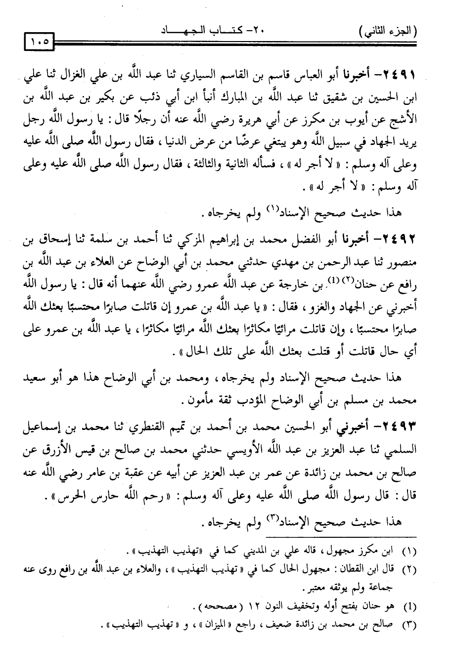2492 - أَخْبَرَنَا أَبُو الْفَضْلِ مُحَمَّدُ بْنُ إِبْرَاهِيمَ الْمُزَكِّي ، ثنا أَحْمَدُ بْنُ سَلَمَةَ ، ثنا إِسْحَاقُ بْنُ مَنْصُورٍ ، ثنا عَبْدُ الرَّحْمَنِ بْنُ مَهْدِيٍّ ، حَدَّثَنِي مُحَمَّدُ بْنُ أَبِي الْوَضَّاحِ ، عَنِ الْعَلَاءِ بْنِ عَبْدِ اللَّهِ بْنِ رَافِعٍ ، عَنْ حَنَانِ بْنِ خَارِجَةَ ، عَنْ عَبْدِ اللَّهِ بْنِ عَمْرٍو رَضِيَ اللَّهُ عَنْهُ ، أَنَّهُ قَالَ: يَا رَسُولَ اللَّهِ ، أَخْبِرْنِي عَنِ الْجِهَادِ وَالْغَزْوِ . فَقَالَ: " يَا عَبْدَ اللَّهِ بْنَ عَمْرٍو إِنْ قَاتَلْتَ صَابِرًا مُحْتَسِبًا ، بَعَثَكَ اللَّهُ صَابِرًا مُحْتَسِبًا ، وَإِنْ قَاتَلْتَ مُرَائِيًا مُكَاثِرًا ، بَعَثَكَ اللَّهُ مُرَائِيًا مُكَاثِرًا ، يَا عَبْدَ اللَّهِ بْنَ عَمْرٍو عَلَى أَيِّ حَالٍ قَاتَلْتَ أَوْ قُتِلْتَ بَعَثَكَ اللَّهُ عَلَى تِلْكَ الْحَالِ "