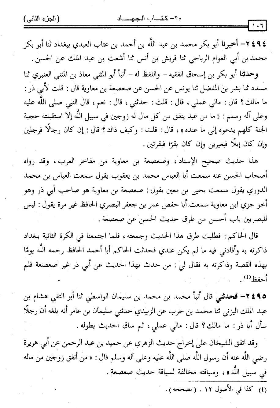 2494 - أَخْبَرَنَا أَبُو بَكْرٍ مُحَمَّدُ بْنُ عَبْدِ اللَّهِ بْنِ أَحْمَدَ بْنِ عَتَّابٍ الْعَبْدِيُّ بِبَغْدَادَ ، ثنا أَبُو بَكْرٍ مُحَمَّدُ بْنُ أَبِي الْعَوَّامِ الرِّيَاحِيُّ ، ثنا قُرَيْشُ بْنُ أَنَسٍ ، ثنا أَشْعَثُ بْنُ عَبْدِ الْمَلِكِ ، عَنِ الْحَسَنِ ، وَحَدَّثَنَا أَبُو بَكْرِ بْنُ إِسْحَاقَ الْفَقِيهُ ، وَاللَّفْظُ لَهُ ، أَنْبَأَ أَبُو الْمُثَنَّى مُعَاذُ بْنُ الْمُثَنَّى الْعَنْبَرِيُّ ، ثنا مُسَدَّدٌ ، ثنا بِشْرُ بْنُ الْمُفَضَّلِ ، ثنا يُونُسُ ، عَنِ الْحَسَنِ ، عَنْ صَعْصَعَةَ بْنِ مُعَاوِيَةَ ، قَالَ: قُلْتُ لِأَبِي ذَرٍّ: مَا مَالُكَ ؟ قَالَ: مَالِي عَمَلِي قَالَ: قُلْتُ: حَدِّثْنِي قَالَ: نَعَمْ ، قَالَ النَّبِيُّ صَلَّى اللَّهُ عَلَيْهِ وَسَلَّمَ: " مَا مِنْ عَبْدٍ يُنْفِقُ مِنْ كُلِّ مَالٍ لَهُ زَوْجَيْنِ فِي سَبِيلِ اللَّهِ ، إِلَّا اسْتَقْبَلَتْهُ حَجَبَةُ الْجَنَّةِ كُلُّهُمْ يَدْعُوهُ إِلَى مَا عِنْدَهُ " قَالَ: قُلْتُ: وَكَيْفَ ذَاكَ ؟ قَالَ: " إِنْ كَانَ رِجَالًا فَرَجُلَيْنِ ، وَإِنْ كَانَ إِبِلًا فَبَعِيرَيْنِ ، وَإِنْ كَانَ بَقَرًا فَبَقَرَتَيْنِ "